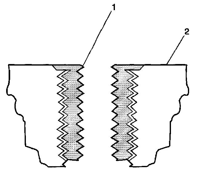 The thread repair process involves a solid, thin walled, self-locking, carbon steel, bushing type insert (1). During the bushing installation process, the driver tool expands the bottom external threads of the insert into the base material (2). This action mechanically locks the insert in place. Also, when installed to the proper depth, the flange of the insert will be seated against the counterbore of the repaired hole.