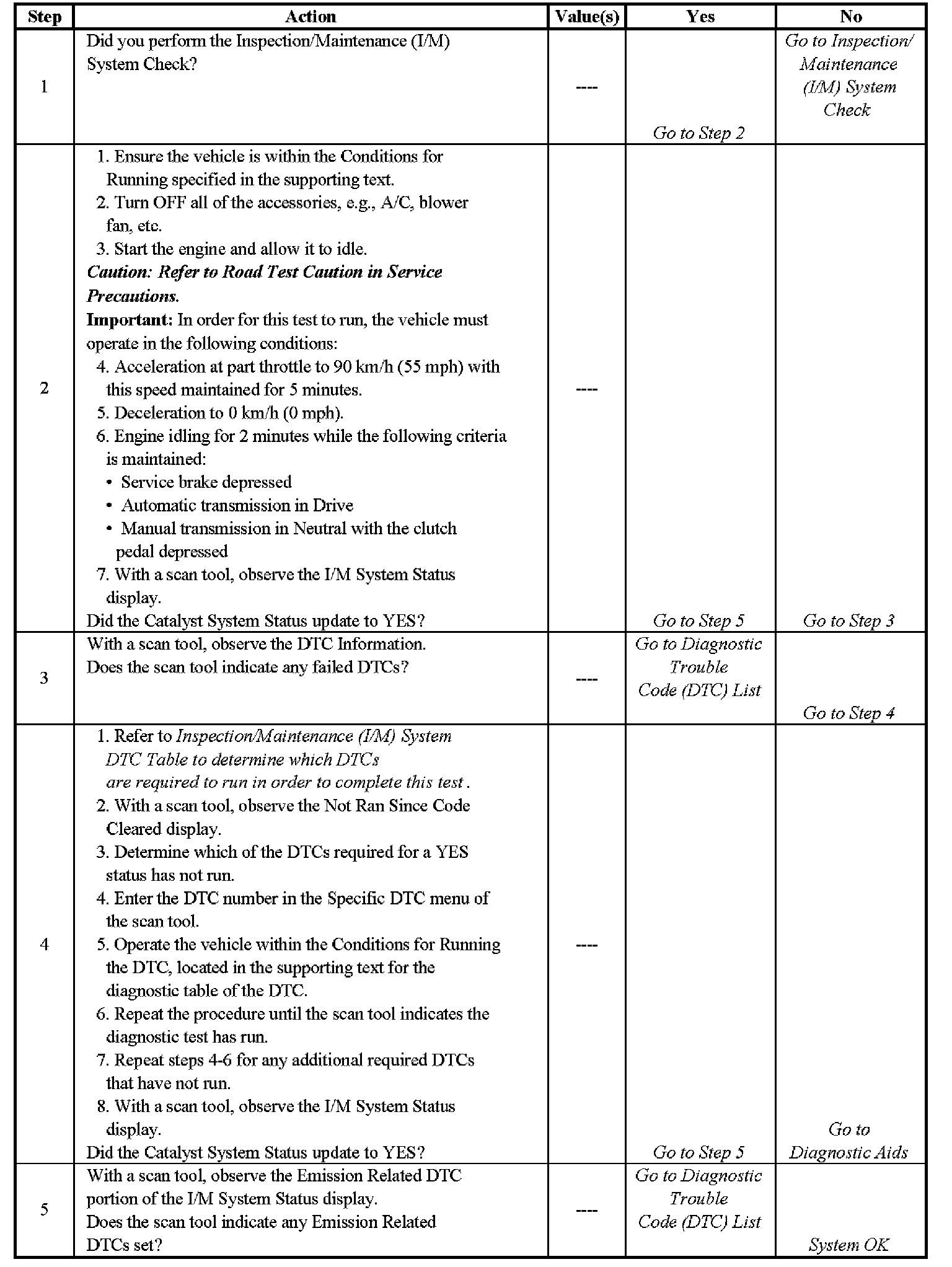 DESCRIPTIONThe purpose of this test is to satisfy the enable criteria necessary to execute I/M readiness diagnostics for the Catalyst System. The test may be used to set the I/M System Status indicators to YES. Ensure the vehicle meets the requirements listed in Conditions for Running before performing this test. Failure to meet the necessary requirements may produce inaccurate test results.