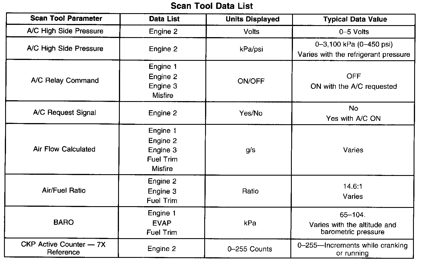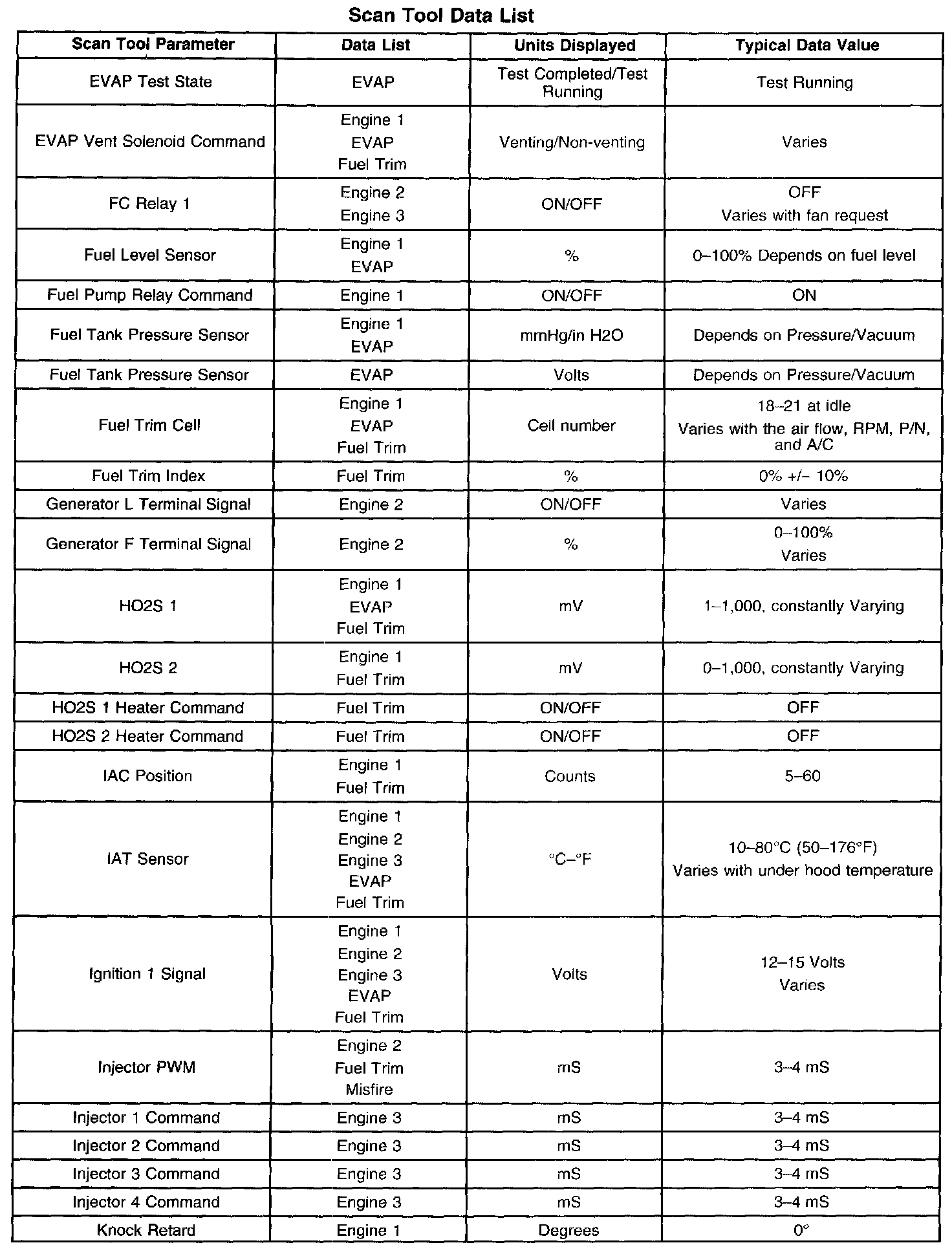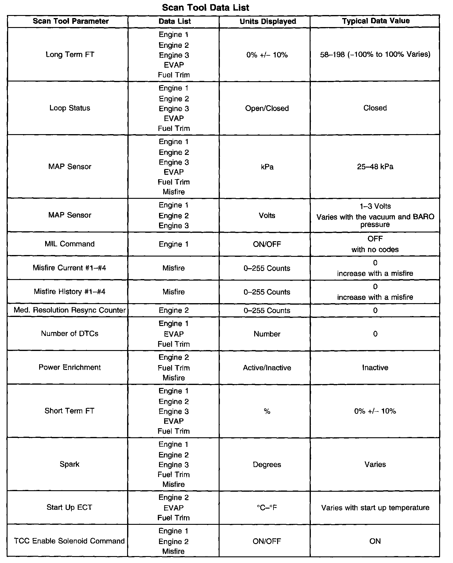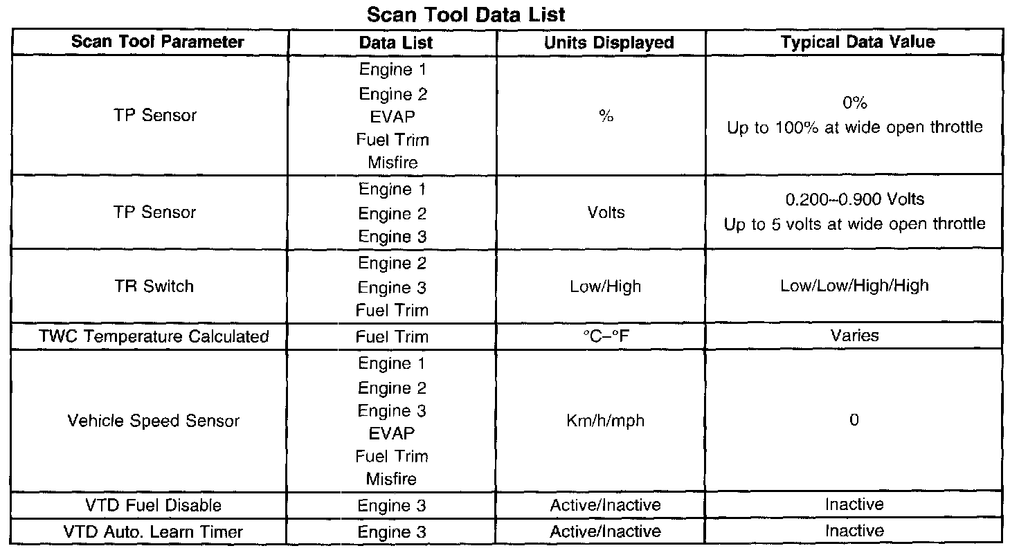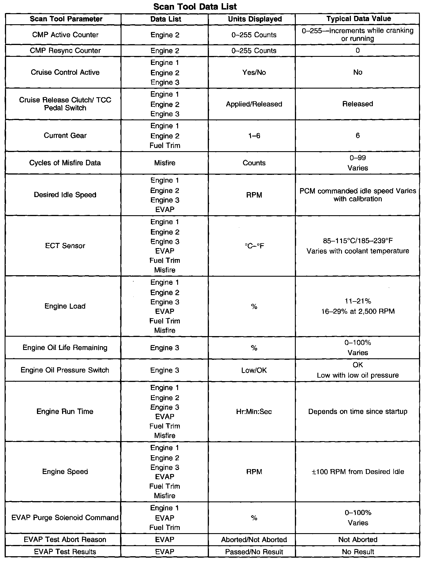 The Engine Scan Tool Data List contains all engine related parameters that are available on the scan tool. The list is arranged in alphabetical order. The parameters in the Typical Scan Data values column represent values that would be seen on a normally running engine.