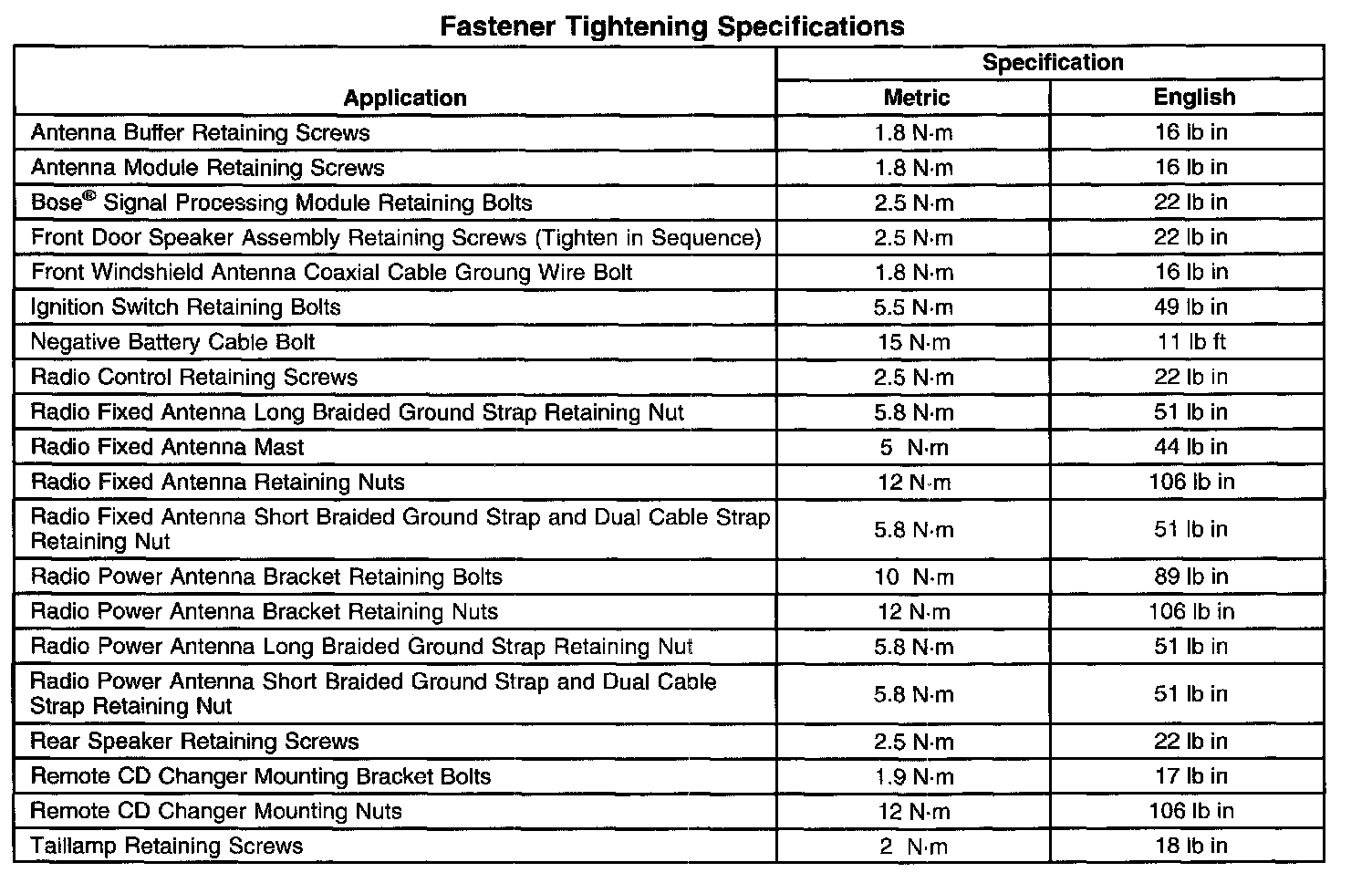 Fastener Tightening Specifications: