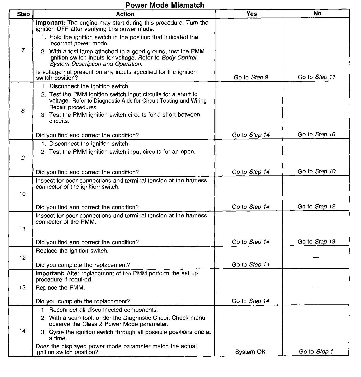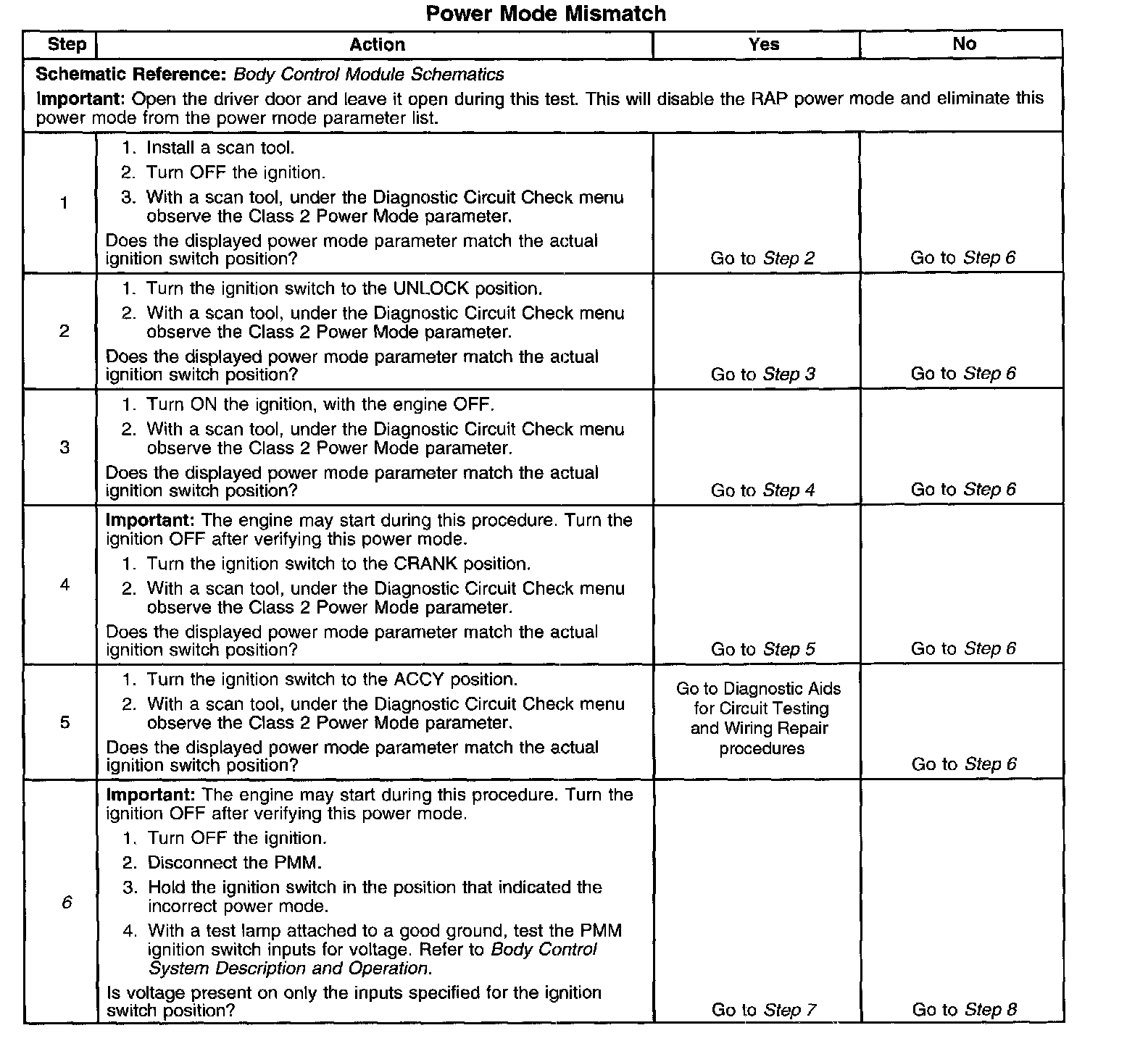 CIRCUIT DESCRIPTIONNormal vehicle class 2 communications and module operations will not begin until the system power mode has been identified. Discrete wires from the ignition switch contacts are monitored by the power mode master (PMM) module in order to determine the correct power mode. The PMM communicates the system power mode to all class 2 modules on the class 2 serial data line. Refer to Body Control System Description and Operation to identify which module is the PMM and the applicable power mode look up table.