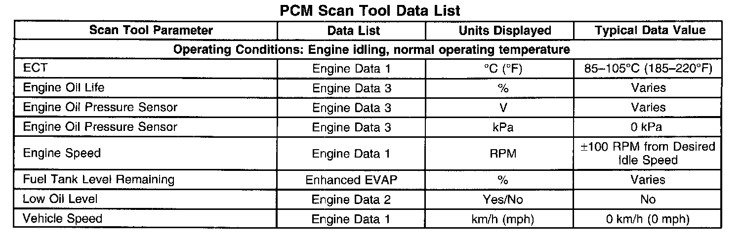 Scan Tool Data List - Powertrain Control Module (PCM)