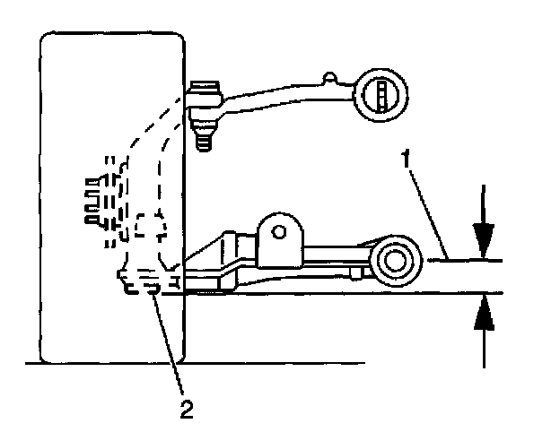 4. Use the J 42854 in order to measure the distance between the lowest point of the ball joint (2) and the center of the front side of the lower control arm mounting bolt (1).