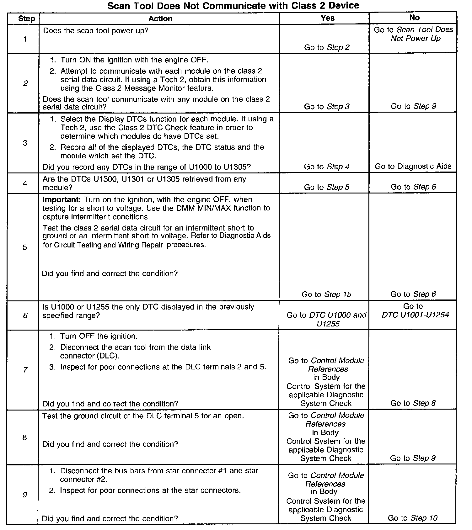 10. An open in the class 2 serial data circuit between the DLC and one of the star connectors will prevent the scan tool from communicating with some modules. This condition will cause multiple communication DTCs to set.