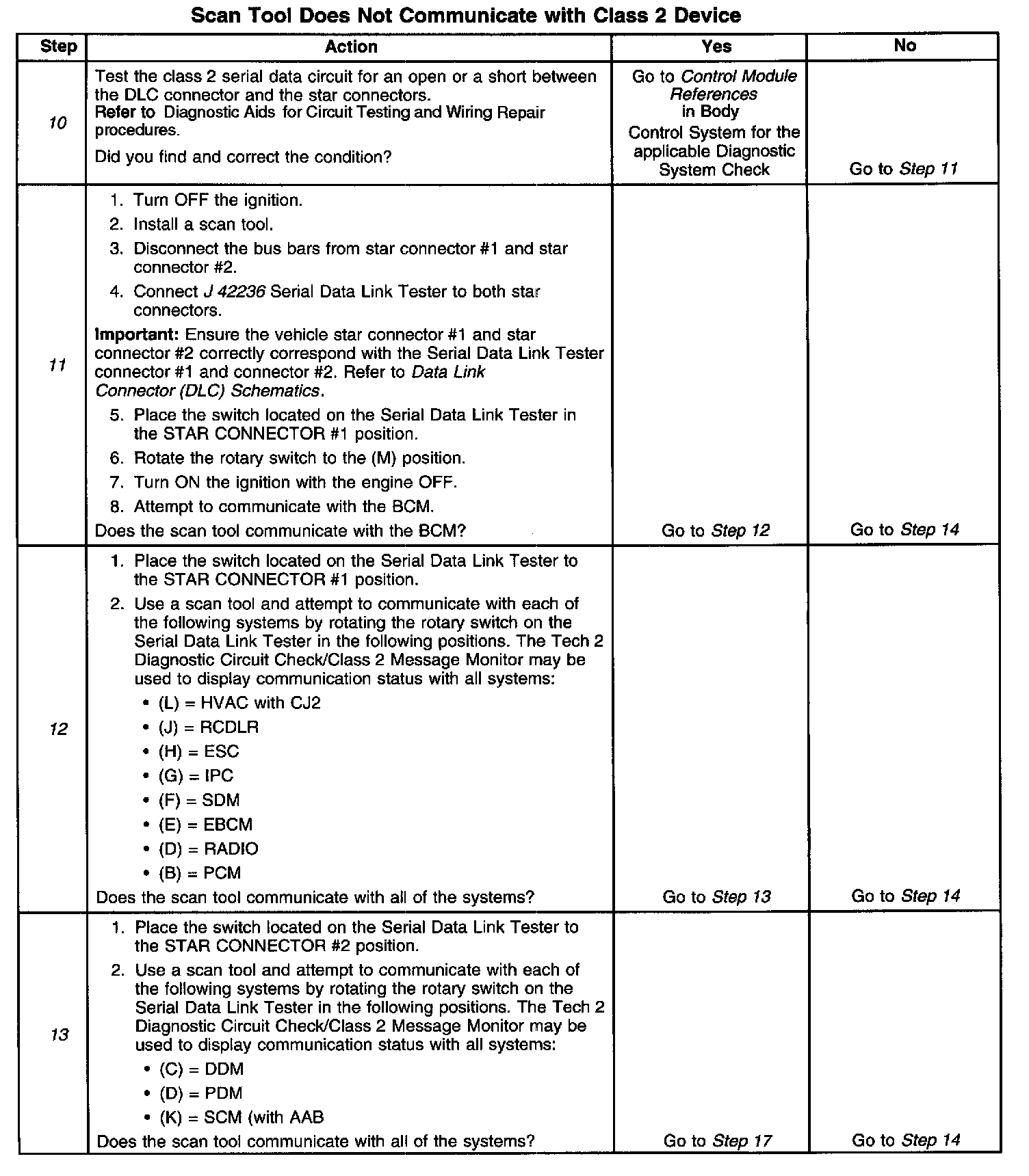 13. This test isolates each module on star connector #2 by communicating with each module separately using the J 42236 Serial Data Link Tester and a scan tool.
