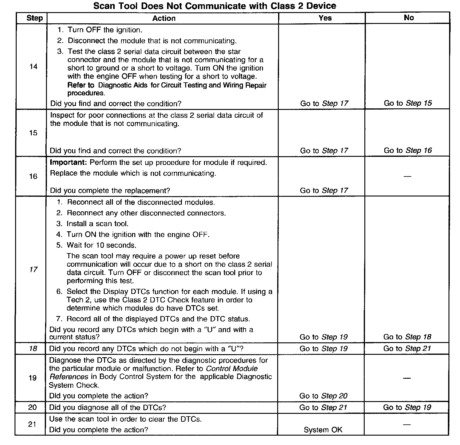 ^ When the class 2 serial data circuit is shorted to ground, U1300 will be set. Refer to DTC U1300, U1301, or U1305 (Generic Short DTC). U1300