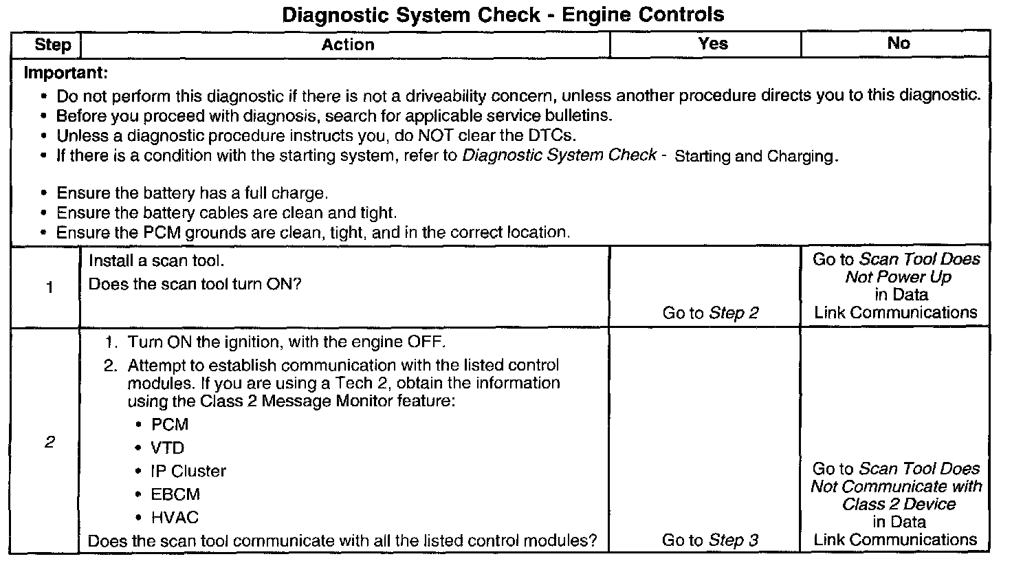 DESCRIPTIONThe Diagnostic System Check-Computers and Controls Systems is an organized approach to identifying a condition that is created by a malfunction in the powertrain control system. The Diagnostic System Check must be the starting point for any driveability concern. The Diagnostic System Check directs the service technician to the next logical step in order to diagnose the concern. Understanding and correctly using the diagnostic table reduces diagnostic time, and prevents the replacement of good parts.