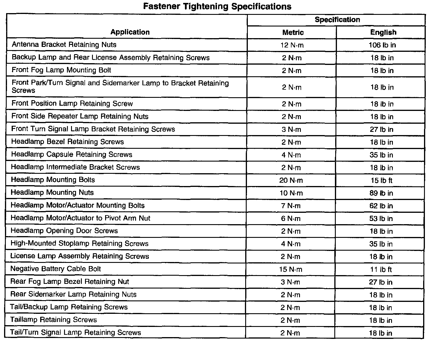 Fastener Tightening Specifications: