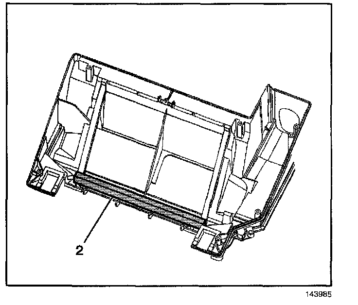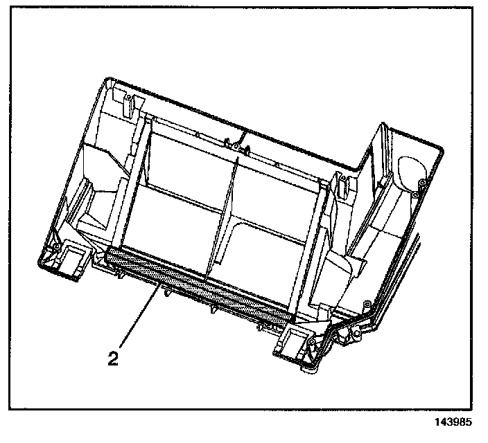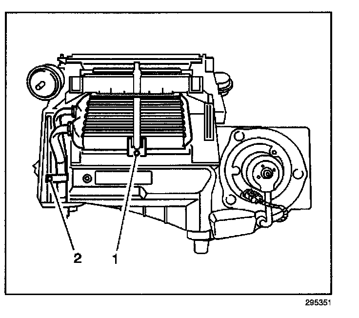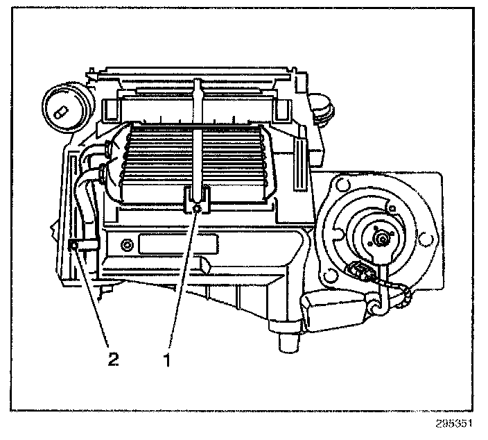 14. Remove and discard the seals (1,2) from the heater core cover.