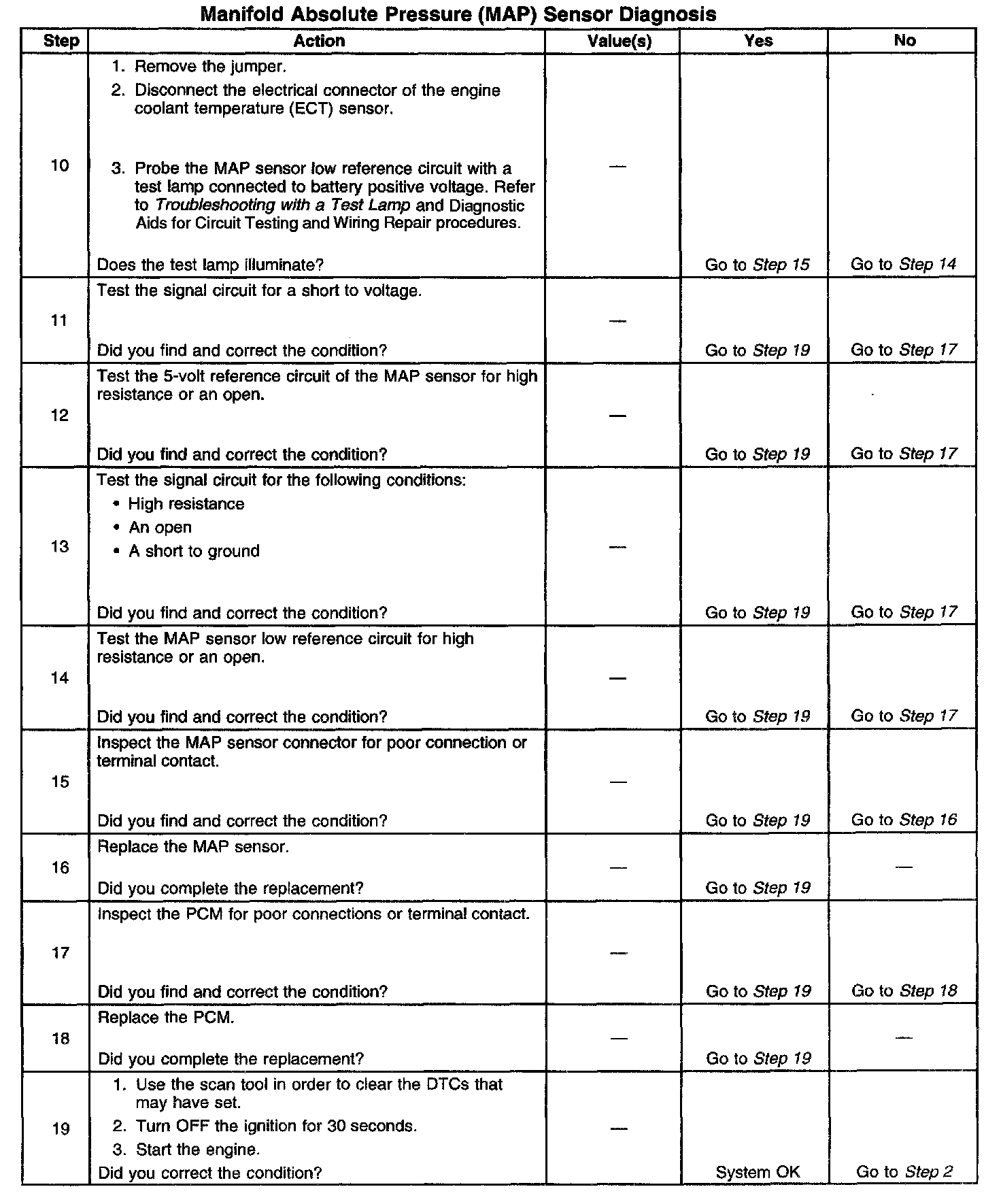 CIRCUIT DESCRIPTIONThe manifold absolute pressure (MAP) sensor responds to pressure changes in the intake manifold which gives an indication of the engine load. The MAP sensor has a 5-volt reference circuit, a low reference circuit, and a signal circuit. The powertrain control module (PCM) supplies 5 volts to the MAP sensor on the 5-volt reference circuit and provides a ground on the low reference circuit. The MAP sensor provides a signal to the PCM on the signal circuit which is relative to the pressure changes in the manifold. With low MAP such as during idle or deceleration, the PCM should detect a low signal voltage. With high MAP such as ignition ON, with the engine OFF or wide-open throttle (WOT), the PCM should detect a high signal voltage. Certain vehicle models will also use the MAP sensor in order to calculate the barometric pressure (BARO) when the ignition switch is turned ON, with the engine OFF. The BARO reading may also be updated whenever the engine is operated at WOT. The PCM monitors the MAP sensor signal for voltage outside of the normal range. If the PCM detects a MAP sensor signal voltage that is excessively high, DTC P0108 will set. If the PCM detects a MAP sensor signal voltage that is excessively low, DTC P0107 will set.