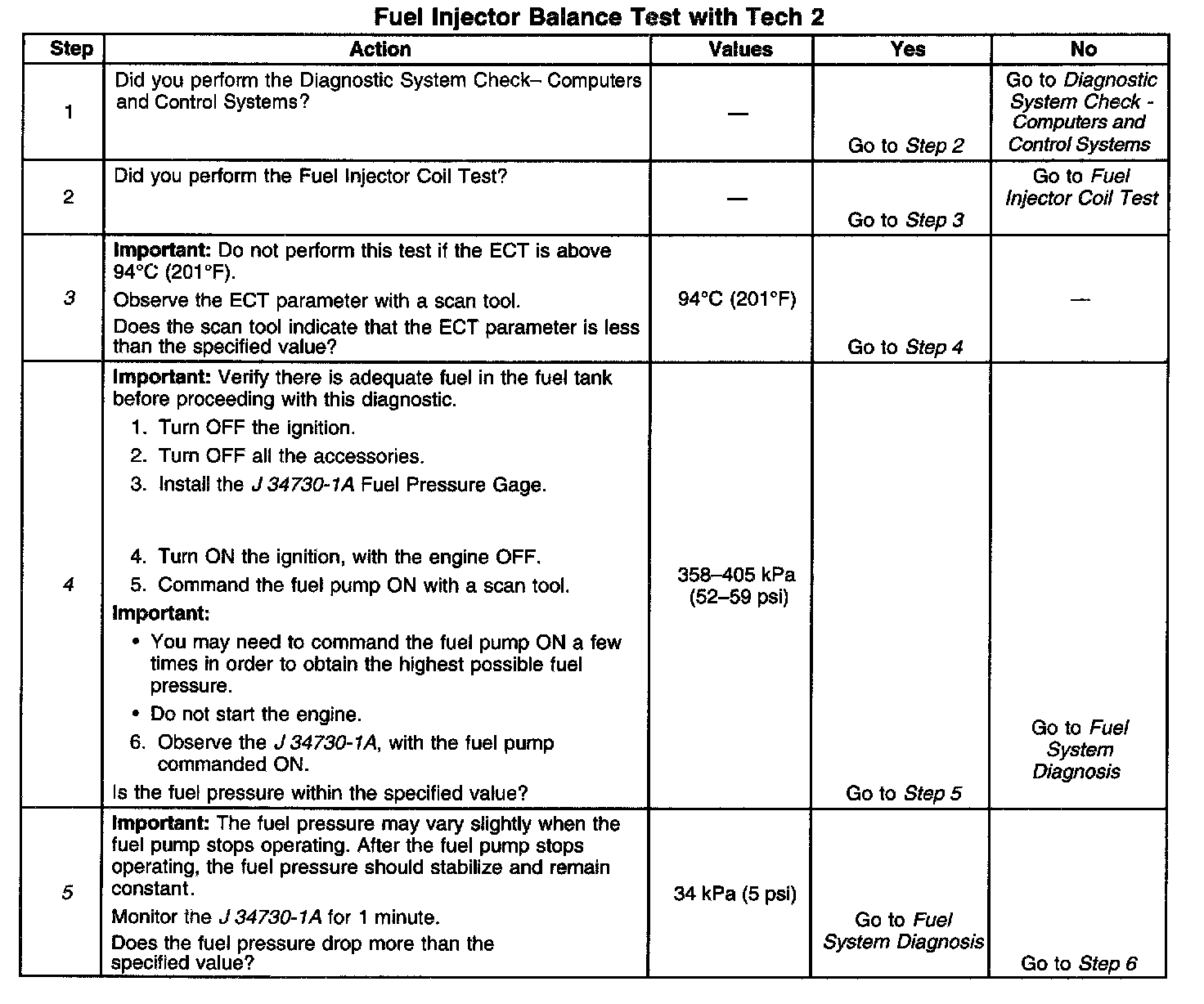 5. The fuel pressure should reach a steady value. Refer to Fuel System Diagnosis if the fuel pressure does not stabilize. Component Tests and General Diagnostics