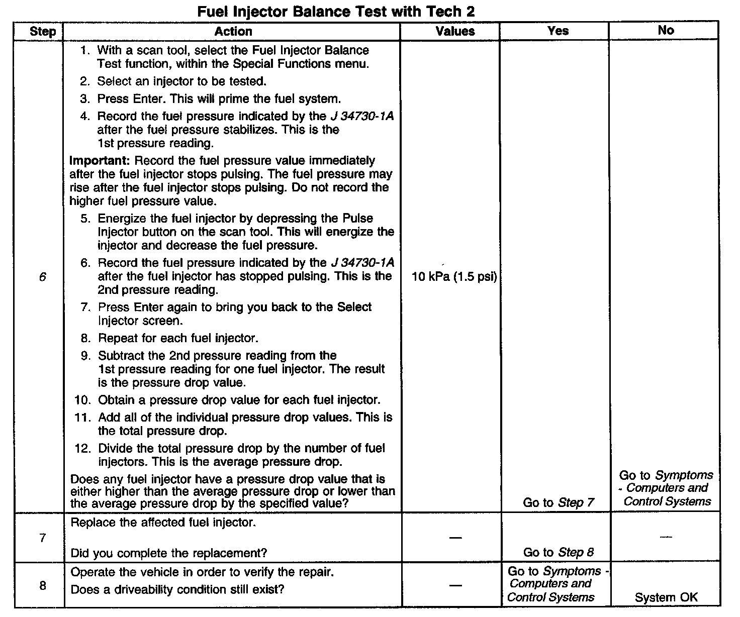 6. If the pressure drop value for each fuel injector is within 10 kPa (1.5 psi) of the average pressure drop value, the fuel injectors are flowing properly. Calculate the pressure drop value for each fuel injector by subtracting the second pressure reading from the first pressure reading.