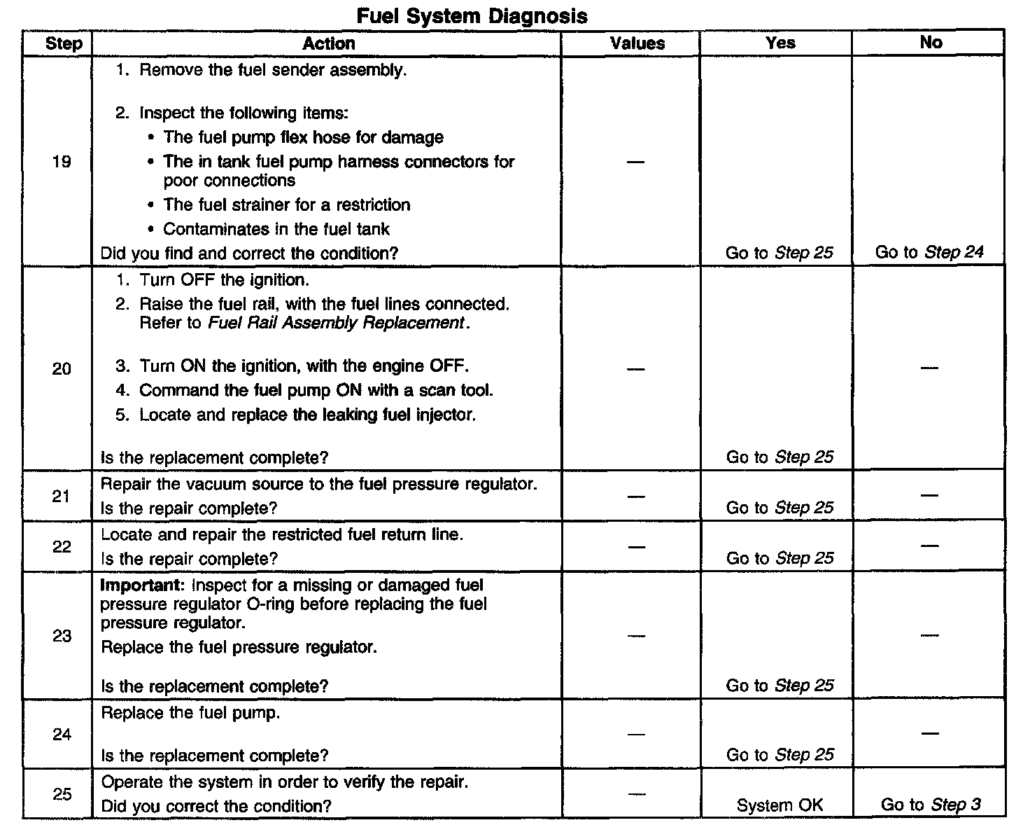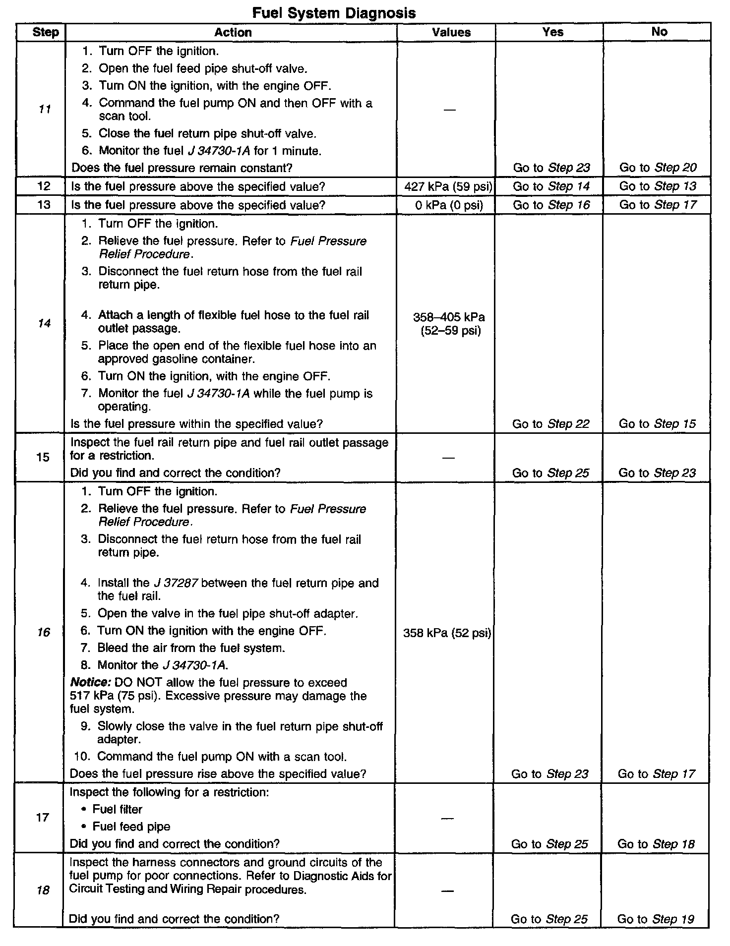 14. This step tests for a restricted fuel return pipe. If the fuel pressure is within the specified values, a restriction in the fuel return pipe is indicated.