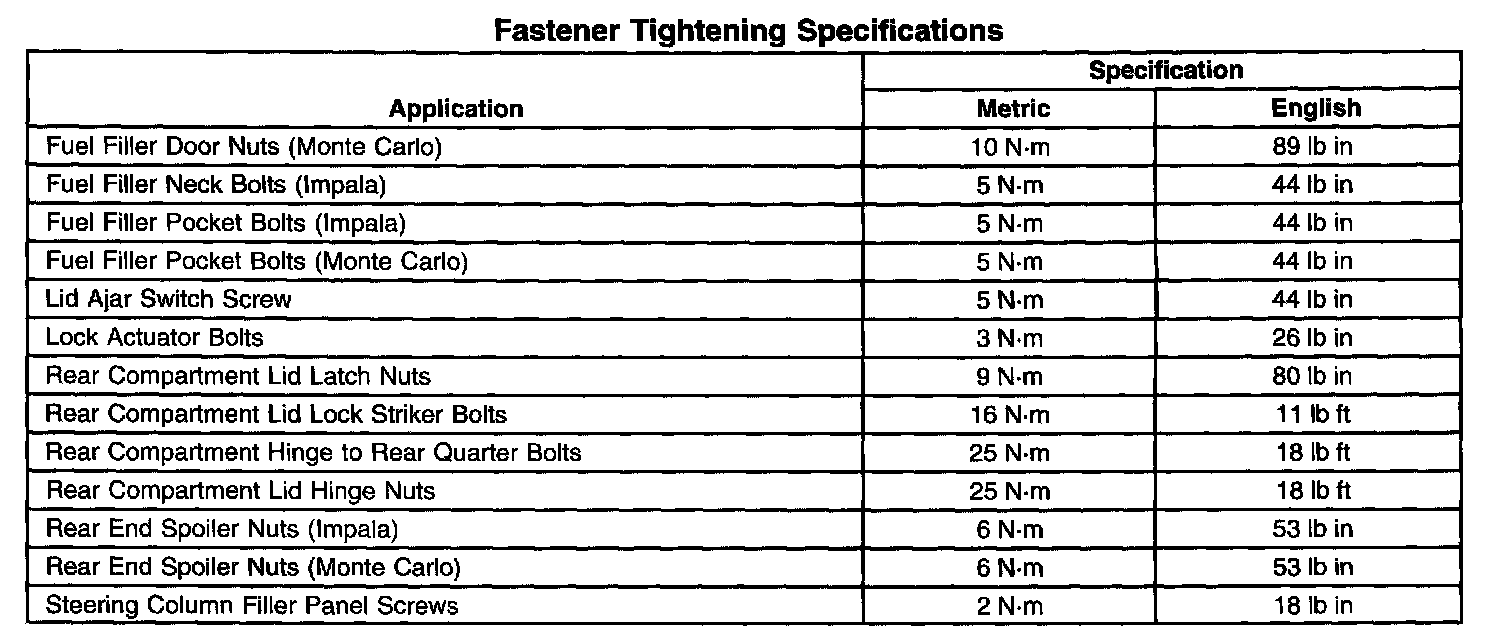 Fastener Tightening Specifications: