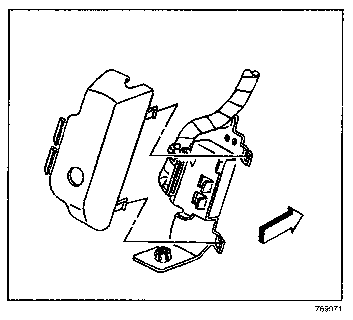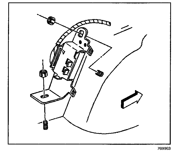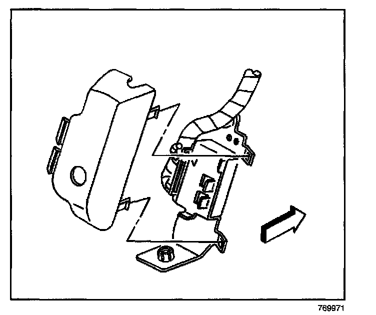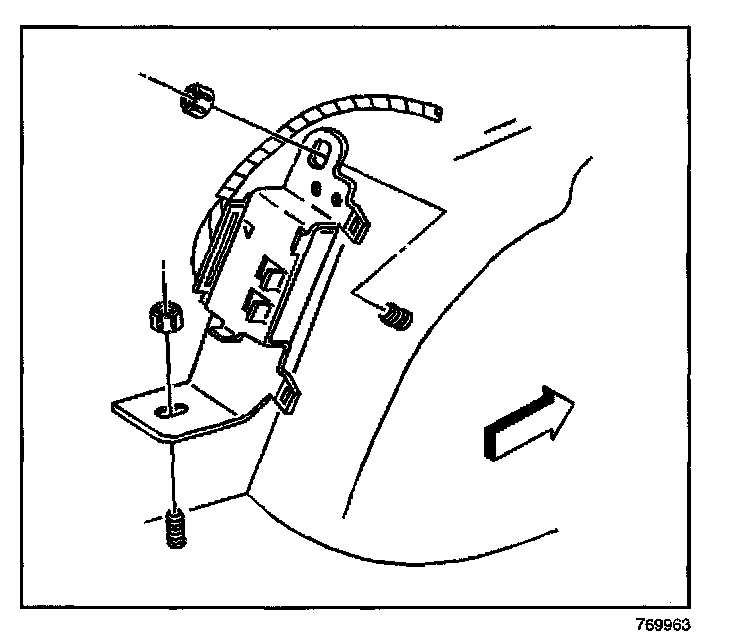 10. Slide the plastic bracket assembly inboard, under the metal bracket. Remove the plastic bracket assembly from the metal bracket.