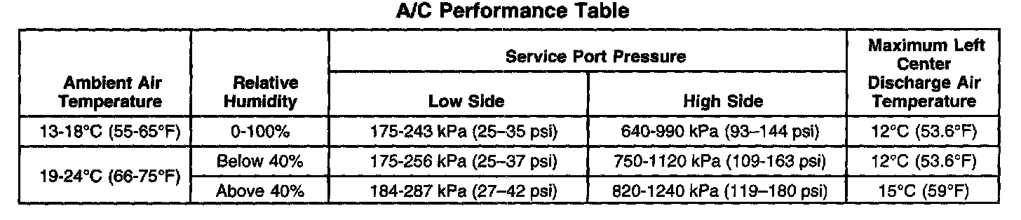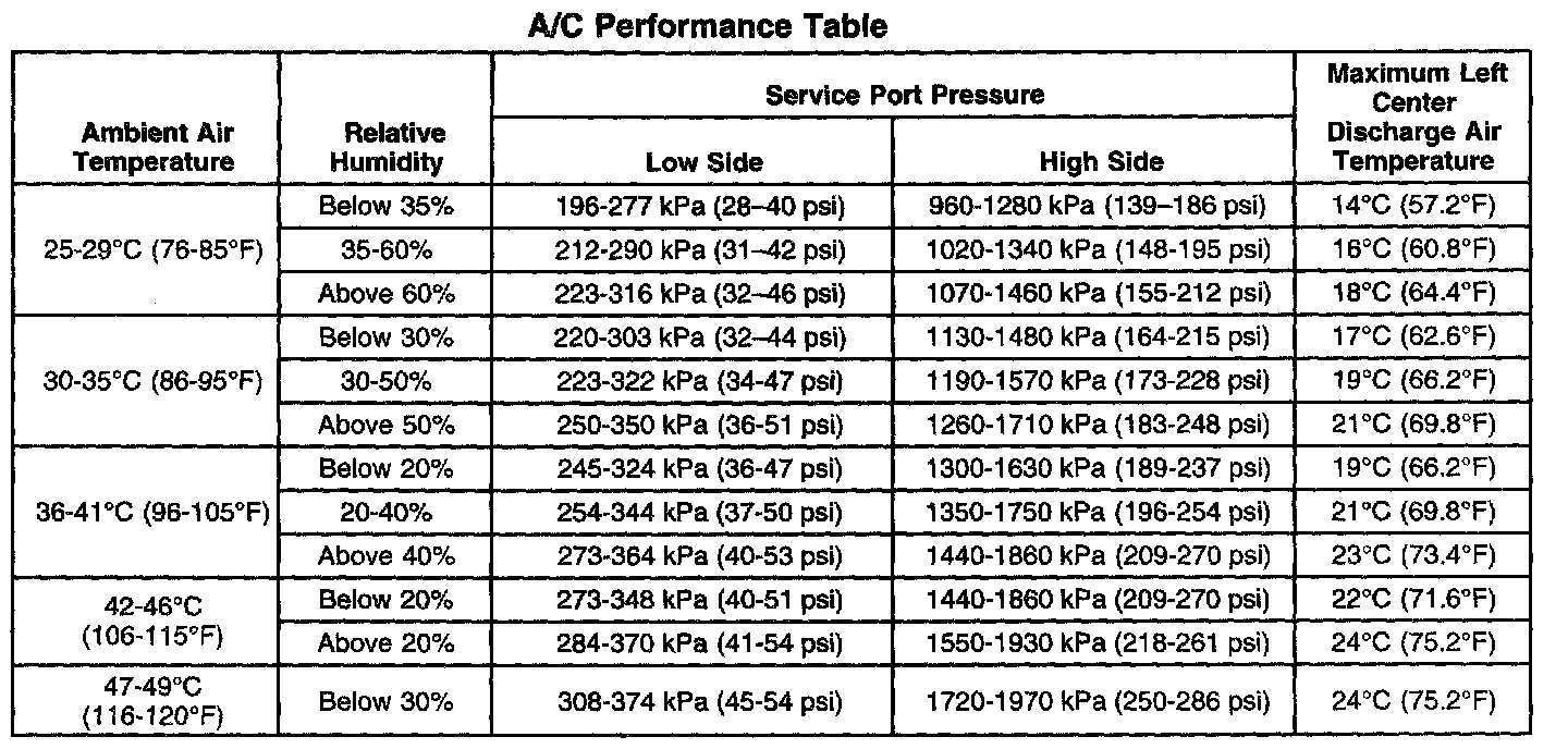 A/C System Performance Table