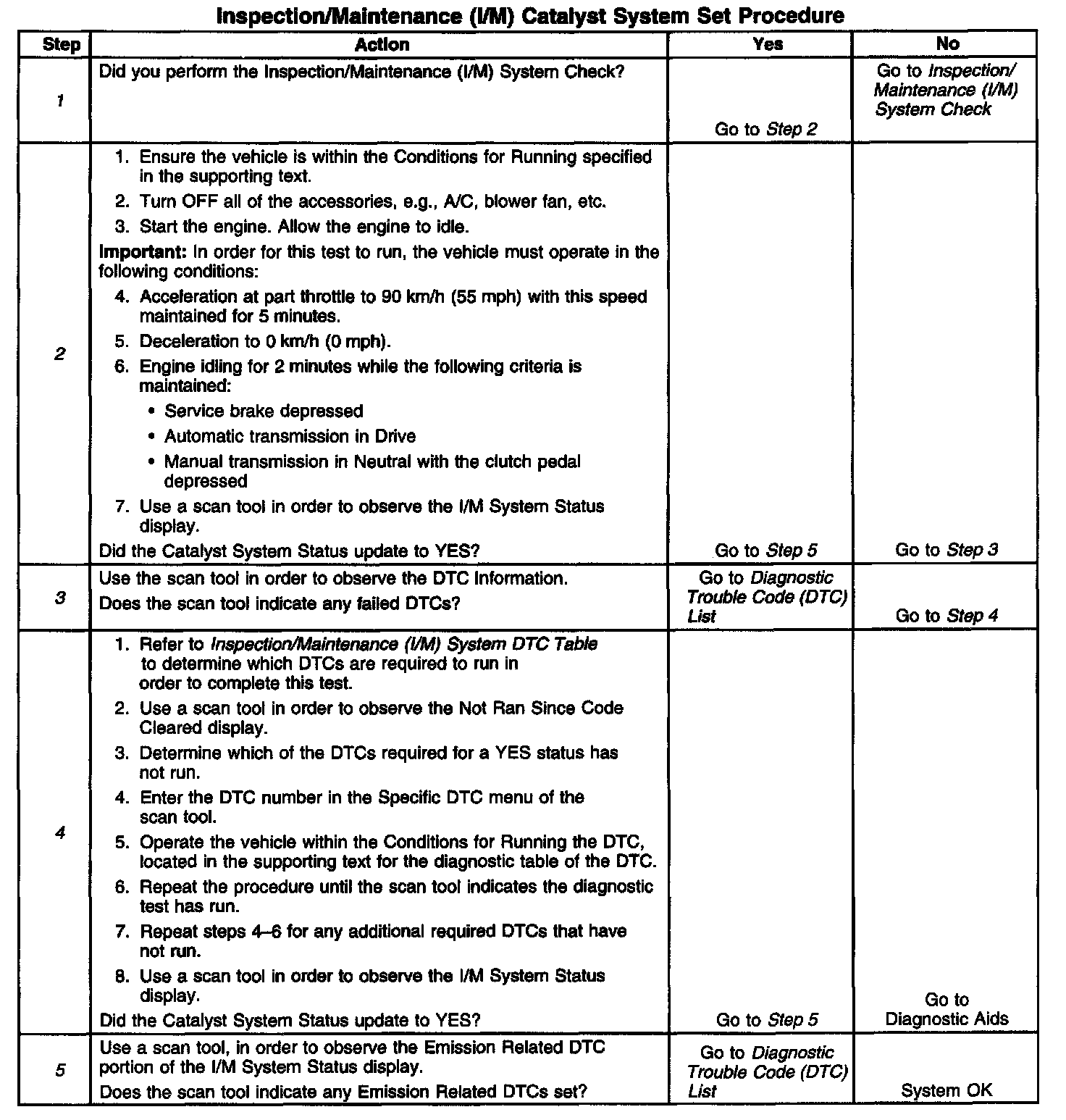 3. This step is to identify a first failure of a type B DTC. A DTC only appears on the I/M System Status display when the DTC becomes a MIL illuminating DTC. This occurs on the second failure of a type B DTC. A first failure of a type B DTC will not allow the I/M System Status to update to YES. Refer to Diagnostic Aids.