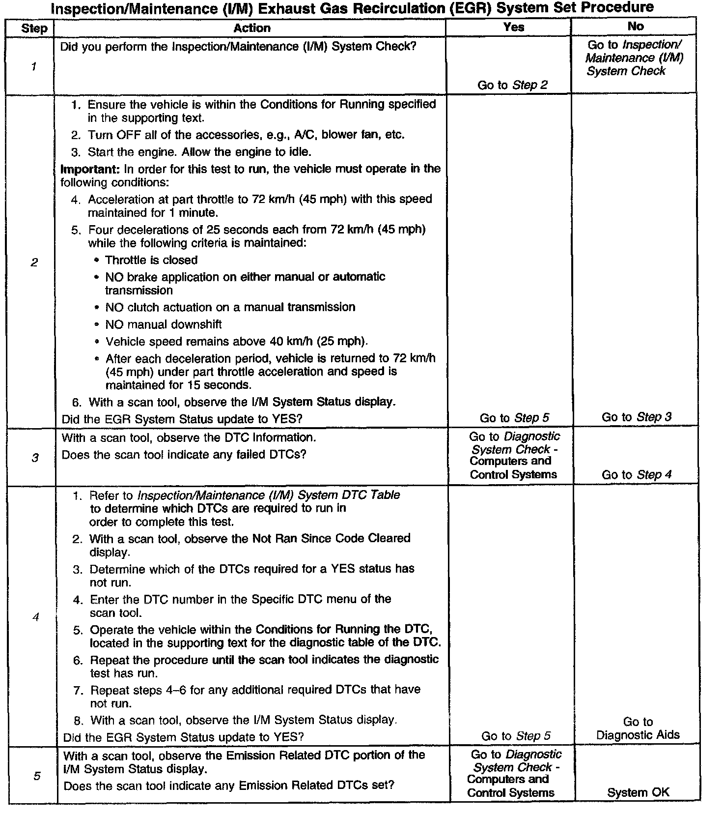 The control module only runs the EGR Active Tests during a gradual deceleration with a closed throttle and a vehicle speed above 40 km/h (25 mph). Several deceleration cycles may be necessary in order to accumulate a sufficient number of EGR flow samples. The procedure outlined in the table is for a clear, flat road. If the procedure is performed on a road with a slight down hill grade, the test may acquire the necessary sample counters in one or two decel trips. If the test is interrupted during the procedure, more than three deceleration cycles may be necessary to complete the test. If the status does not update, the test outlined in this procedure can be repeated until the I/M System Status updates to YES.