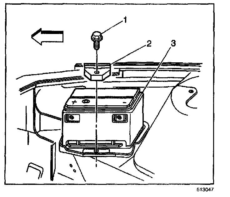 2. Remove the battery hold down retainer bolt (1).