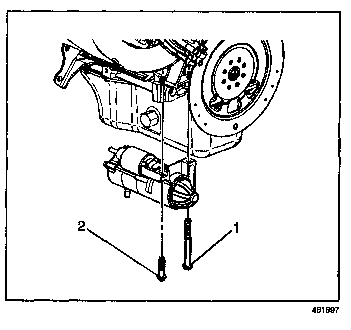 7. Remove the starter bolts (1,2) and remove the starter motor. Remove the shims, if equipped.