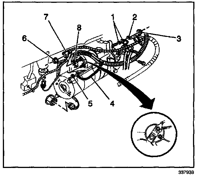 4. Install the positive battery cable (7) and install the solenoid BAT terminal nut (6) finger tight to the starter motor.