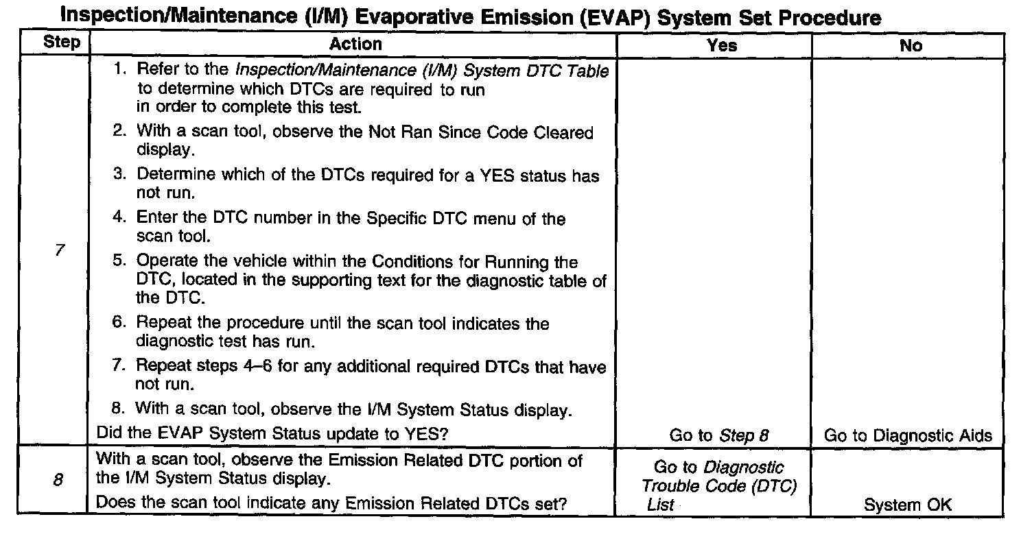 8. The I/M System Status only reports on whether or not a diagnostic has run not the outcome of the test. If any emission related DTC sets after the tests are complete the DTC will require diagnosis.