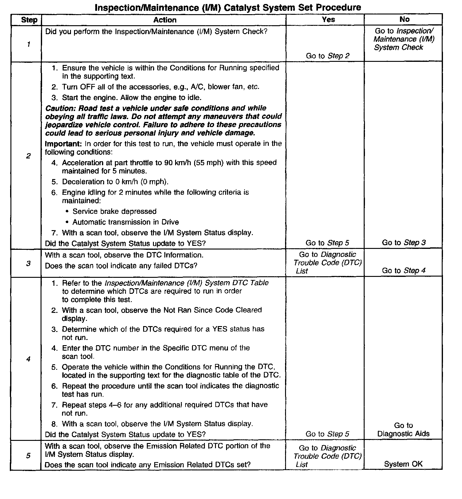 3. This step identifies a first failure of a type B DTC. A DTC only appears on the I/M System Status display when the DTC becomes a MIL illuminating DTC. This occurs on the second failure of a type B DTC. A first failure of a type B DTC will not allow the I/M System Status to update to YES. Refer to Diagnostic Aids. 4. This step identifies any unique or unusual criteria required in order to run the diagnostic test in the event the universal set procedure does not. This Information is located in the service Information under Conditions for Running the DTC.