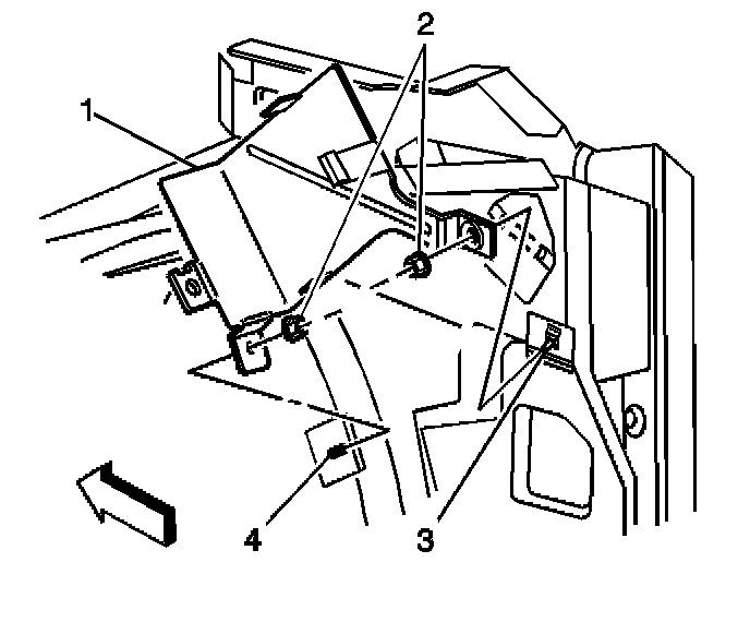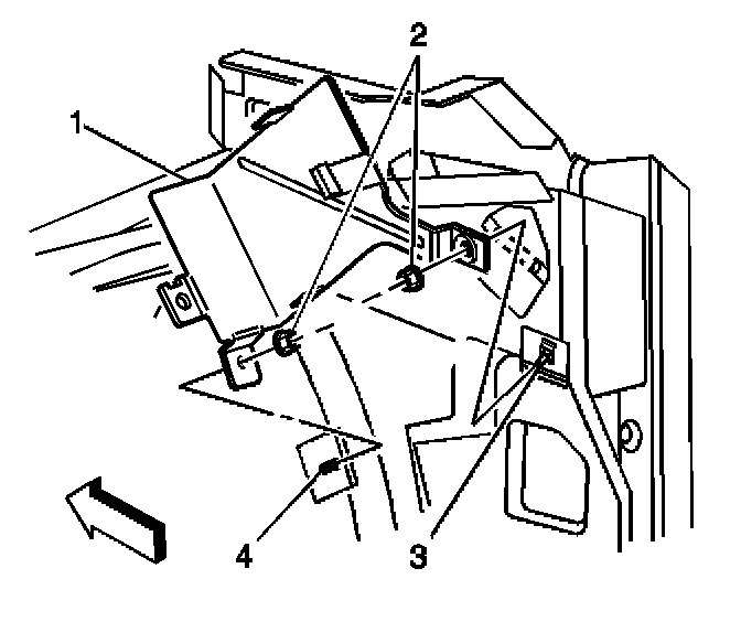 1. Install the bracket assembly (1) to the hinge pillar stud (3), and the dash pan stud (4).