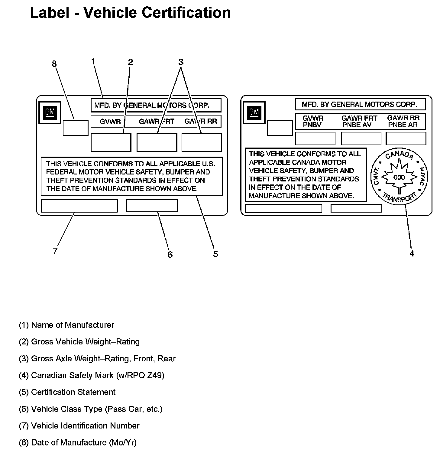 The vehicle certification label is permanently located on the edge of the driver's door. Refer to this label in order to obtain the following information: