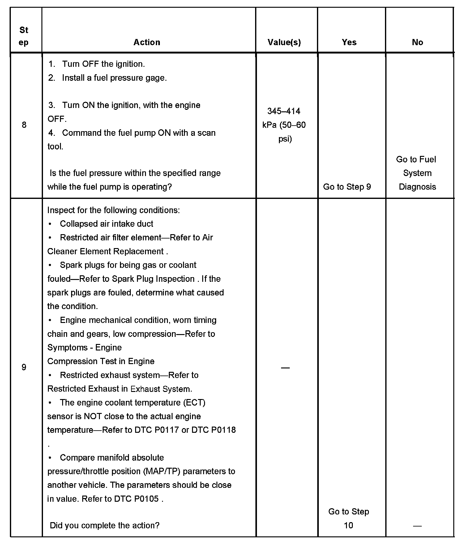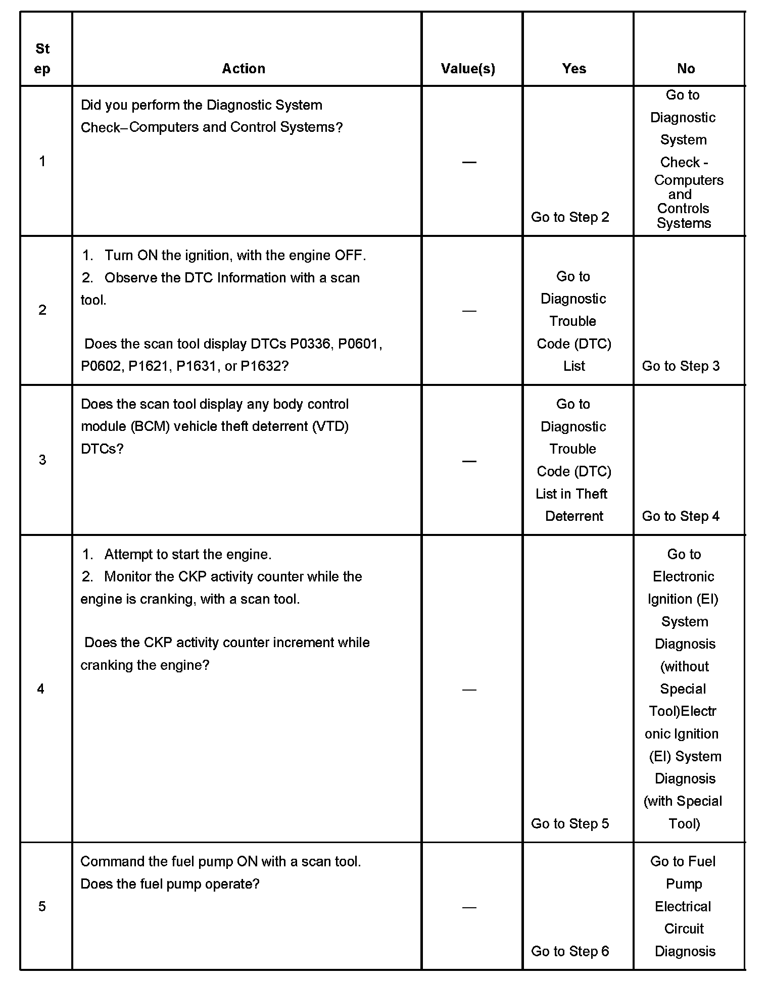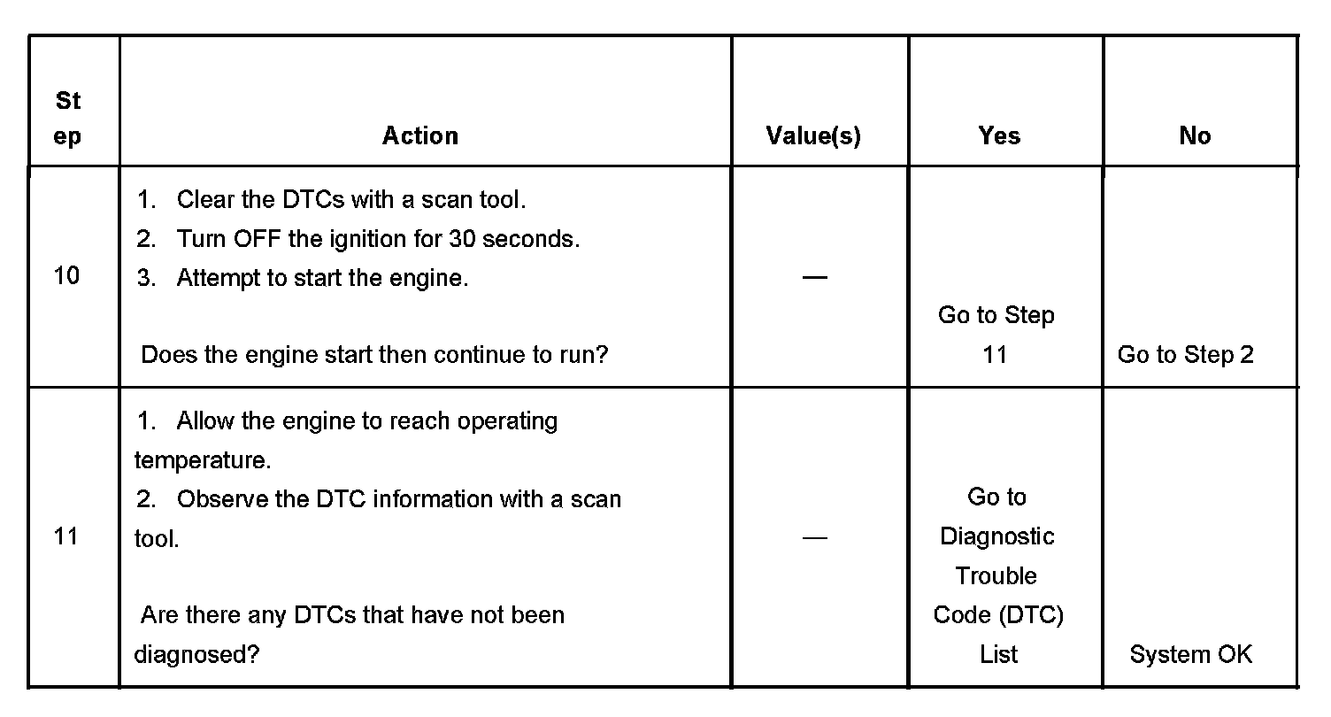 DESCRIPTIONThe Engine Cranks but Does Not Run diagnostic table is an organized approach to identifying a condition that causes an engine not to start. The Engine Cranks but Does Not Run diagnostic table directs the service technician to the appropriate system diagnosis.