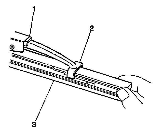 3. Engage the bottom claw (2) of the wiper blade (1) into the notches in wiper blade element (3).
