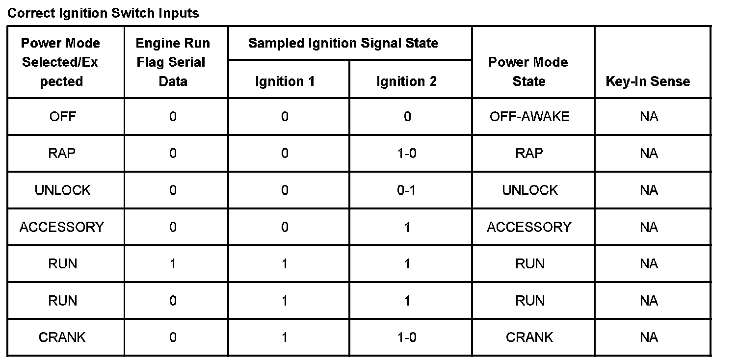 Since the operation of the vehicle systems depends on the power mode, there is a fail-safe plan in place should the PMM fail to send a power mode message. The fail-safe plan covers those modules using exclusively serial data control of power mode as well as those modules with discrete ignition signal inputs.