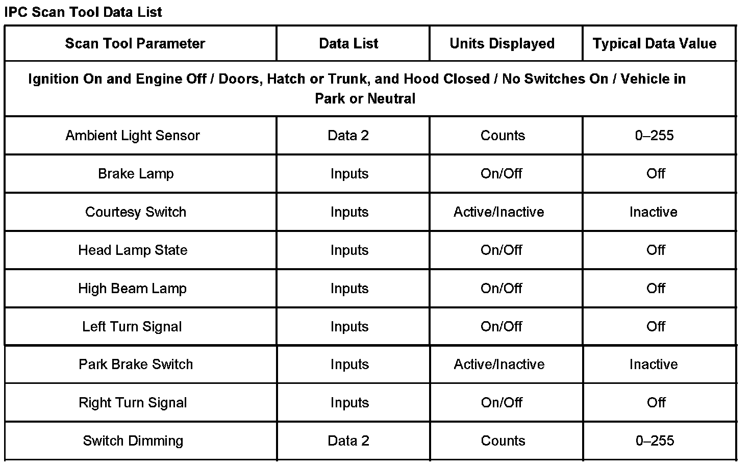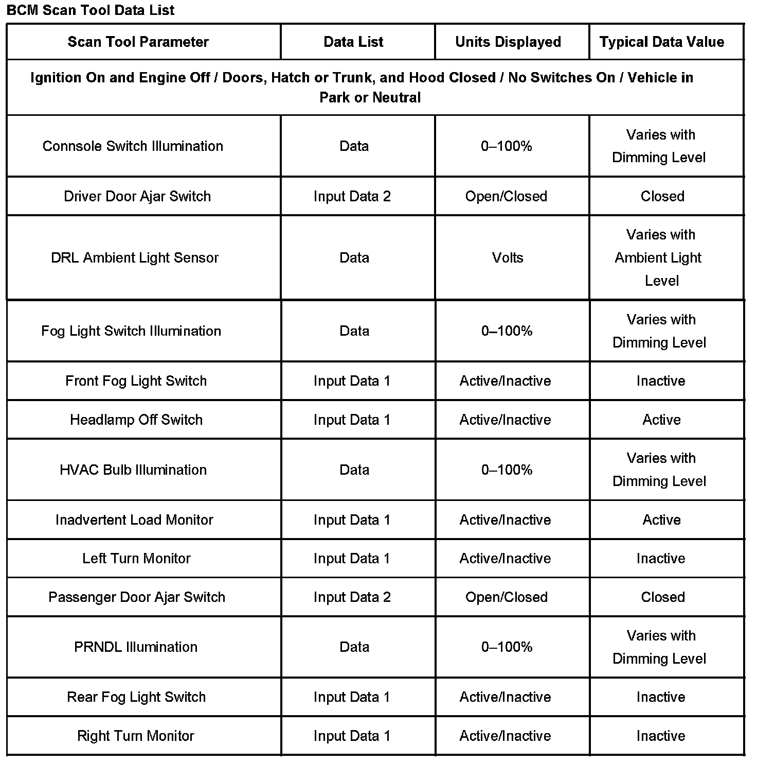 BCM Scan Tool Data List: