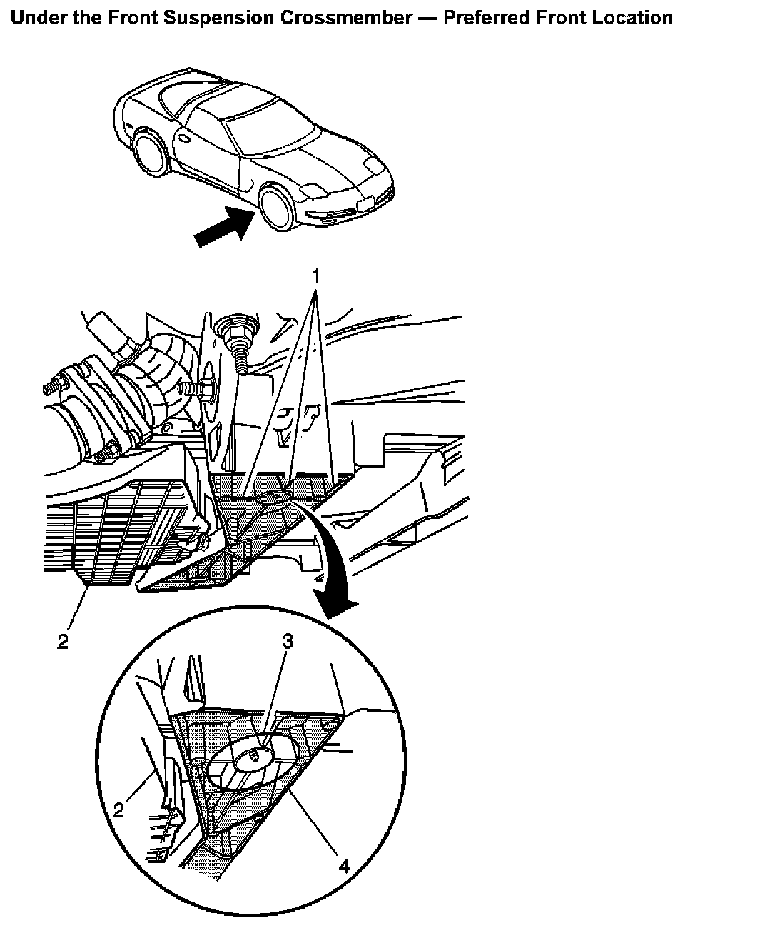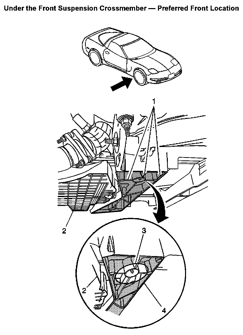 - In the preferred location (3) if possible, spanning at least 2 of the suspension crossmember ribs (1).