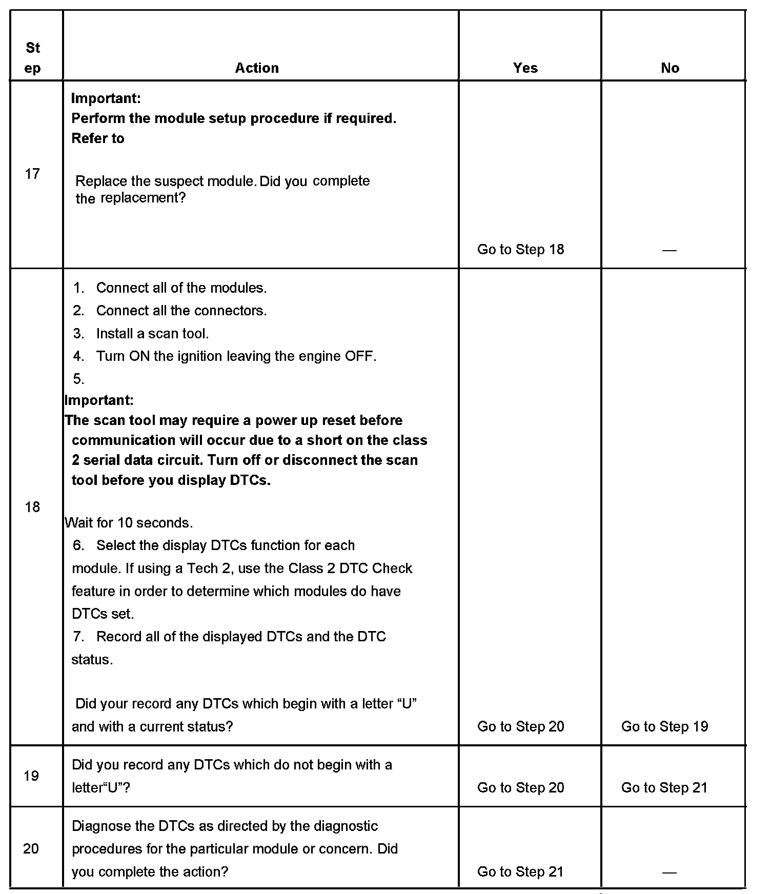 Modules connected to the class 2 serial data circuit monitor for serial data communications during normal vehicle operation. Operating information and commands are exchanged among the modules. Connecting a scan tool to the DLC allows communication with the modules for diagnostic purposes. DTCs may be set due to this symptom and during this diagnostic procedure. Complete the diagnostic procedure in order to ensure all the DTCs are diagnosed and cleared from memory.