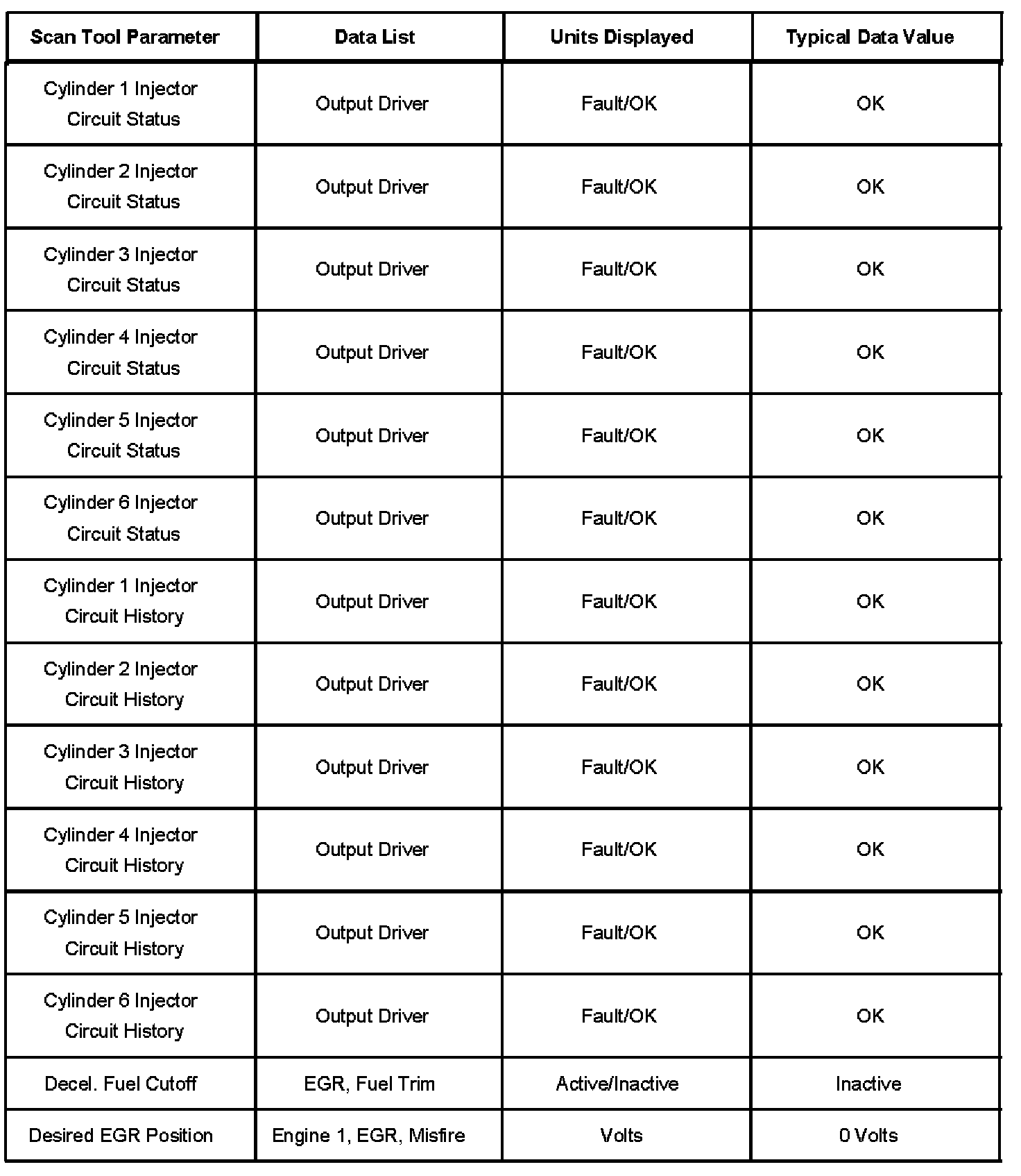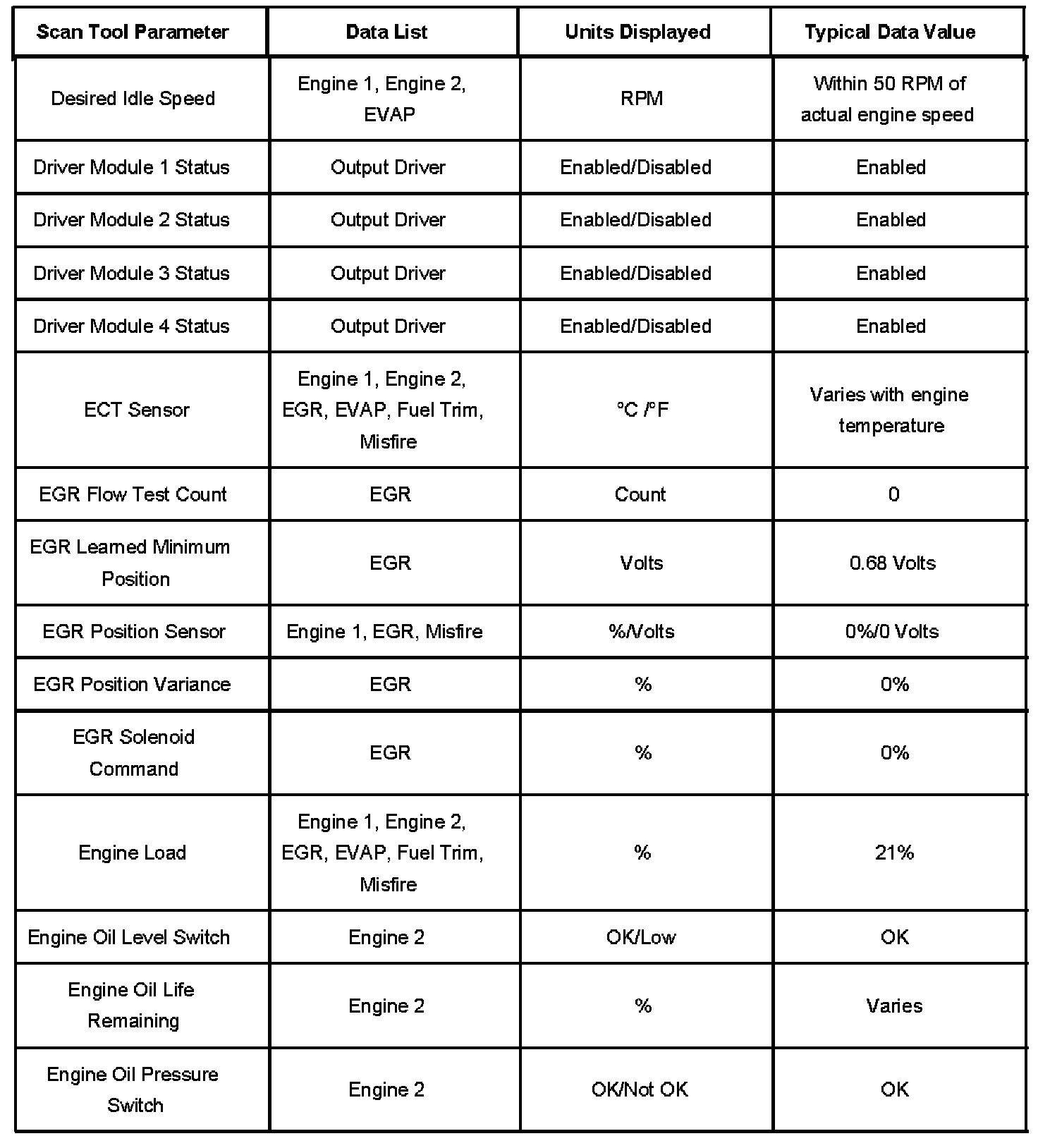- Exhaust gas recirculation (EGR) Data-Contains information specific to the EGR system. This list displays parameters required to verify proper EGR system operation