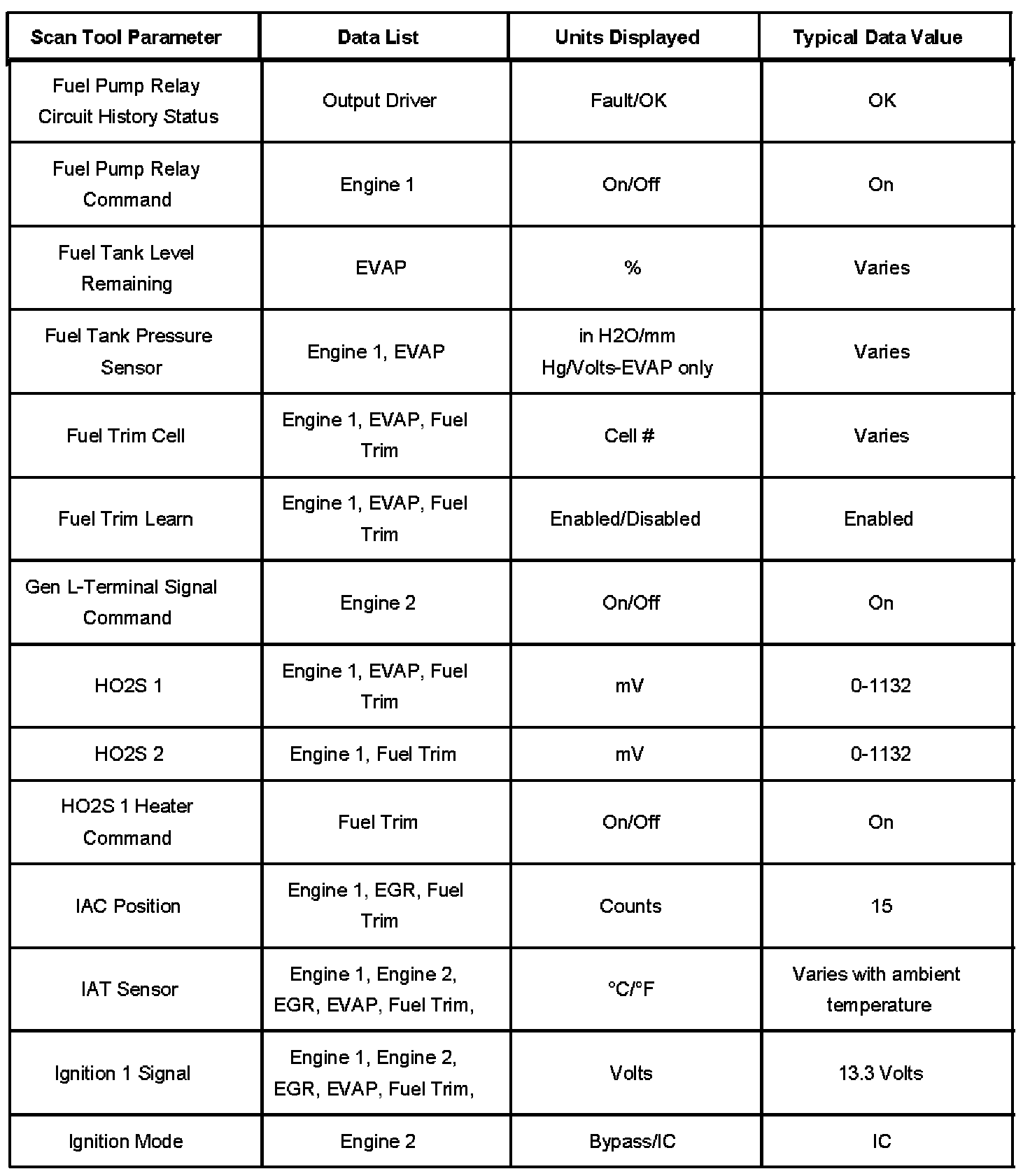 - Engine Data 1-Contains general information regarding fuel delivery, idle air control (IAC) position, heated oxygen sensor (HO2S) 1, HO2S 2, and other basic engine operating conditions.