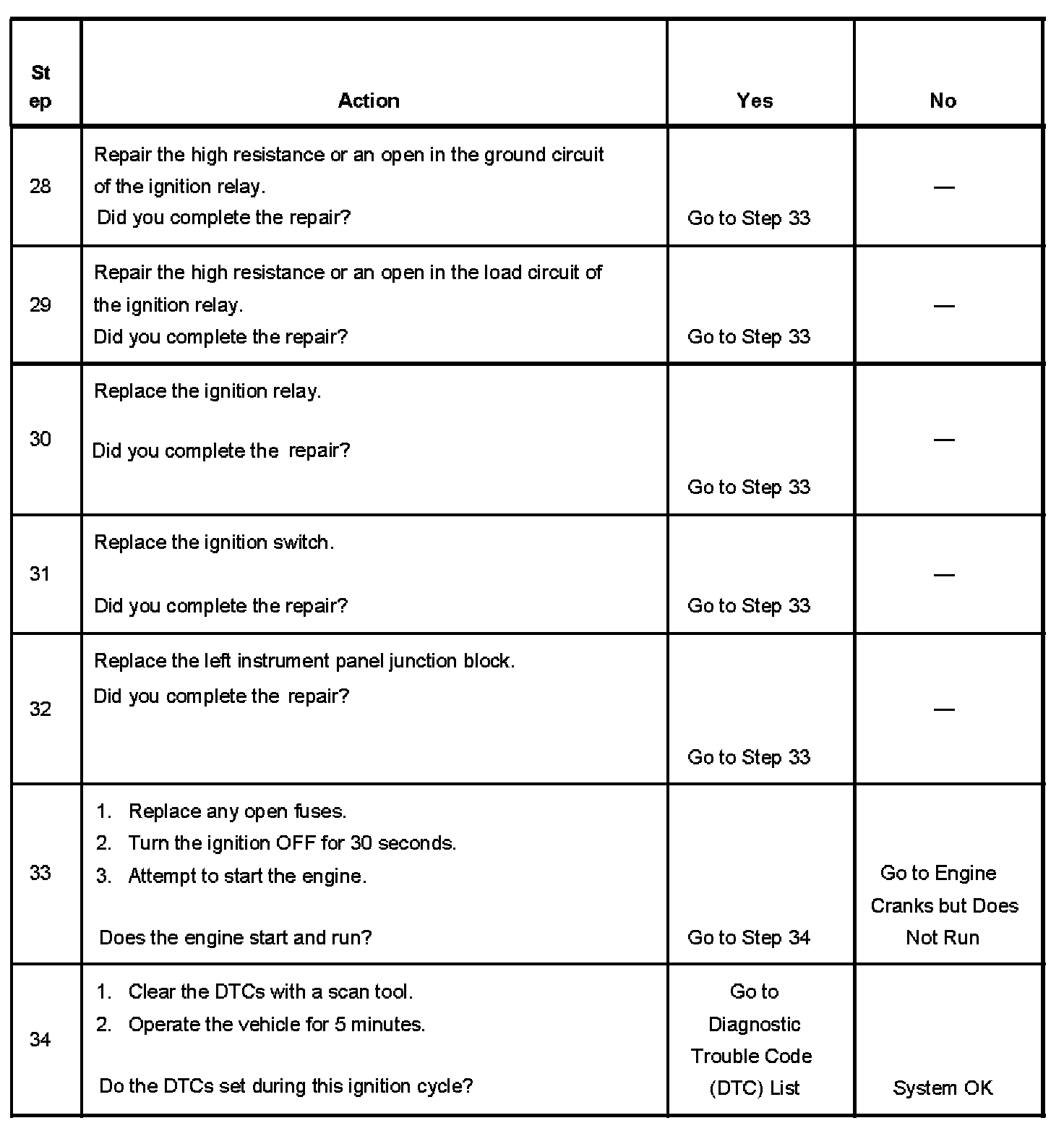If the ignition relay fails to close, the engine will crank, but will not run. The class 2 communications will be available with the use of a scan tool.