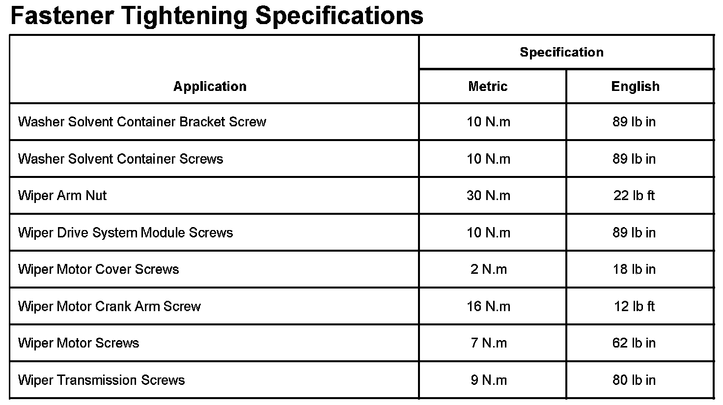 Wiper and Washer Systems: Specifications