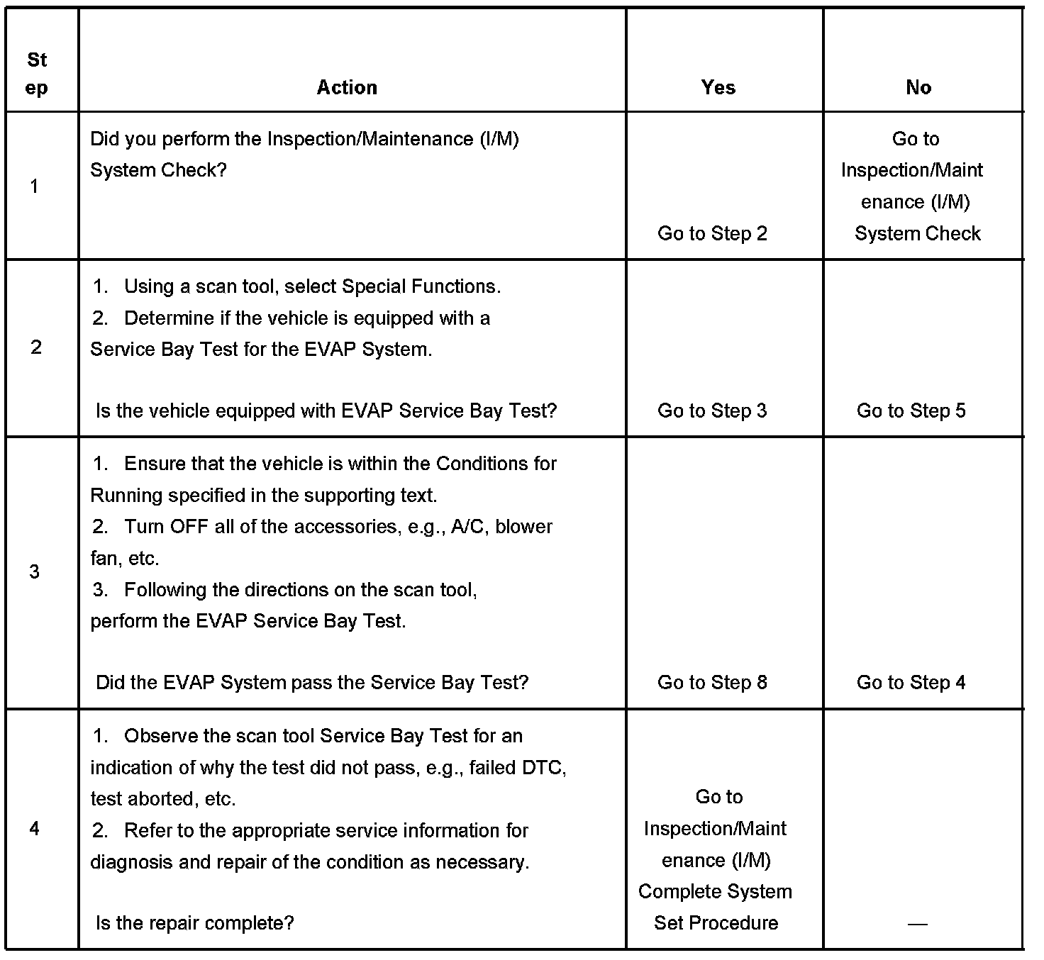 3. This step determines whether or not the EVAP System Test has passed. If the system is operating correctly, the scan tool indicates that the system has passed and the I/M System Status updates to YES. If the EVAP Service Bay Test aborts because of lost enable conditions, the test can be repeated once the enable criteria is met.