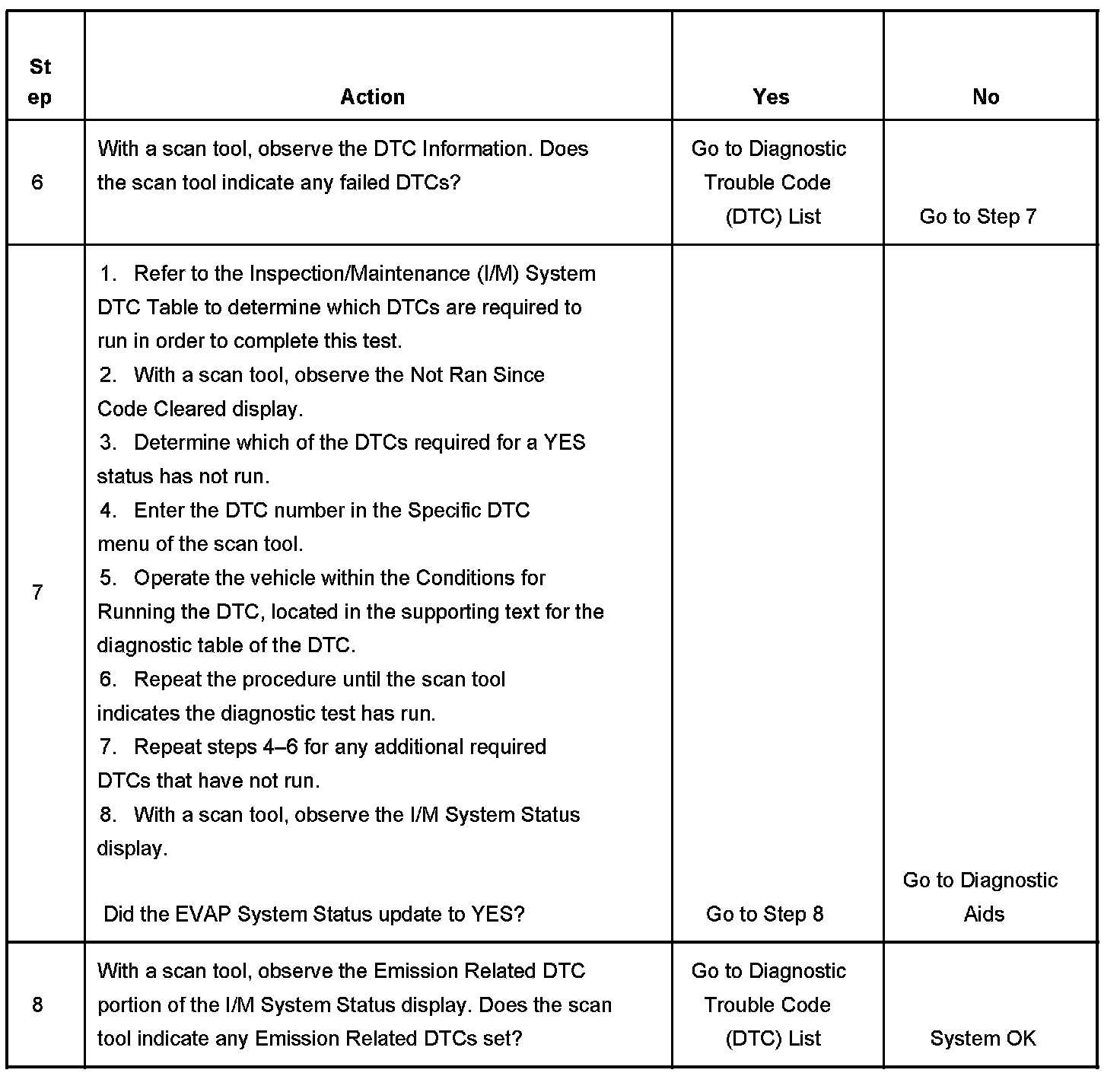 6. This step identifies a first failure of a type B DTC. A DTC only appears on the I/M System Status display when the DTC becomes a MIL illuminating DTC. This occurs on the second failure of a type B DTC. A first failure of a type B DTC will not allow the I/M System Status to update to YES. Refer to Diagnostic Aids.