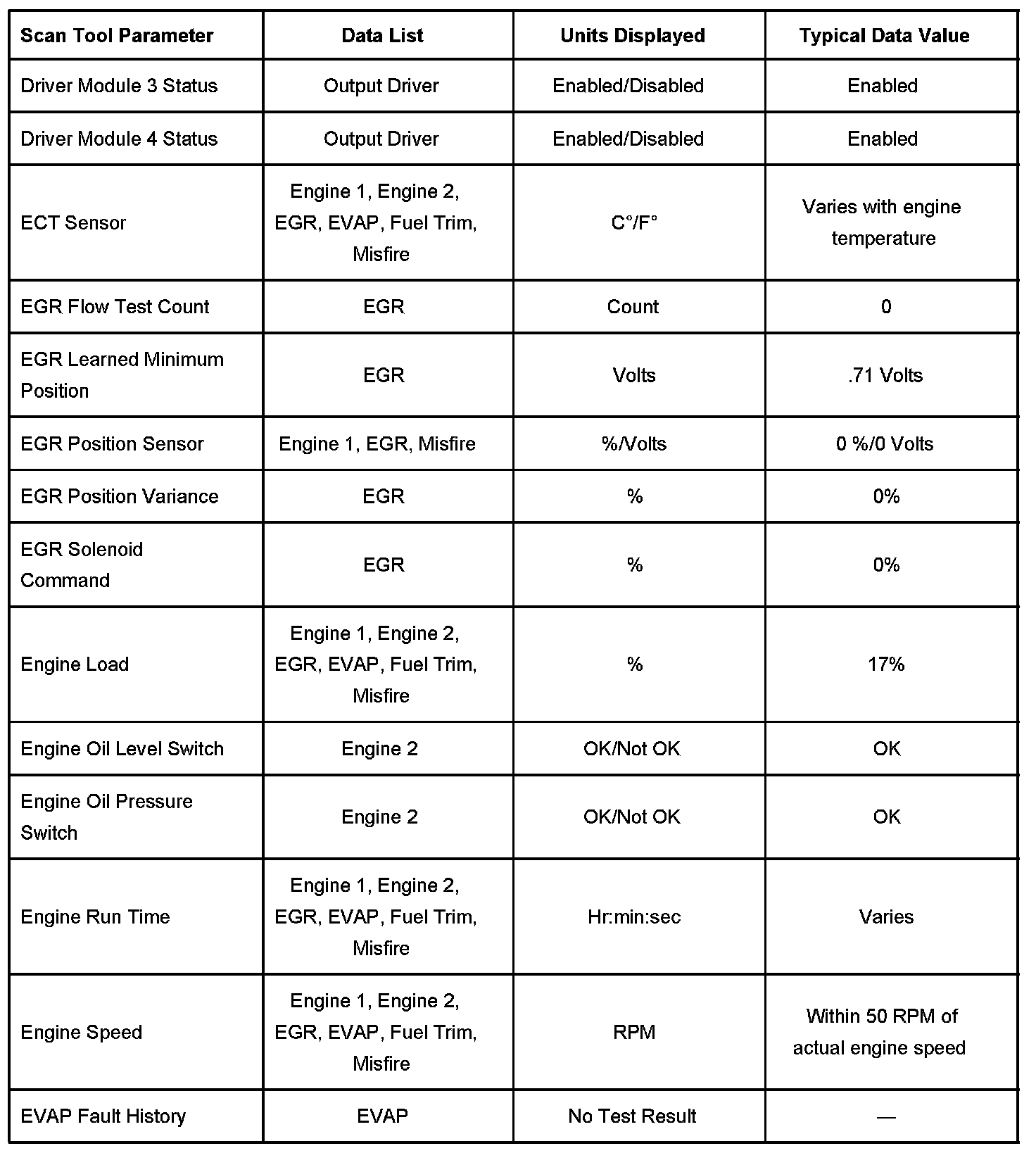 - EGR Data-Contains information specific to the exhaust gas recirculation (EGR) system. This list displays parameters required to verify proper EGR system operation.