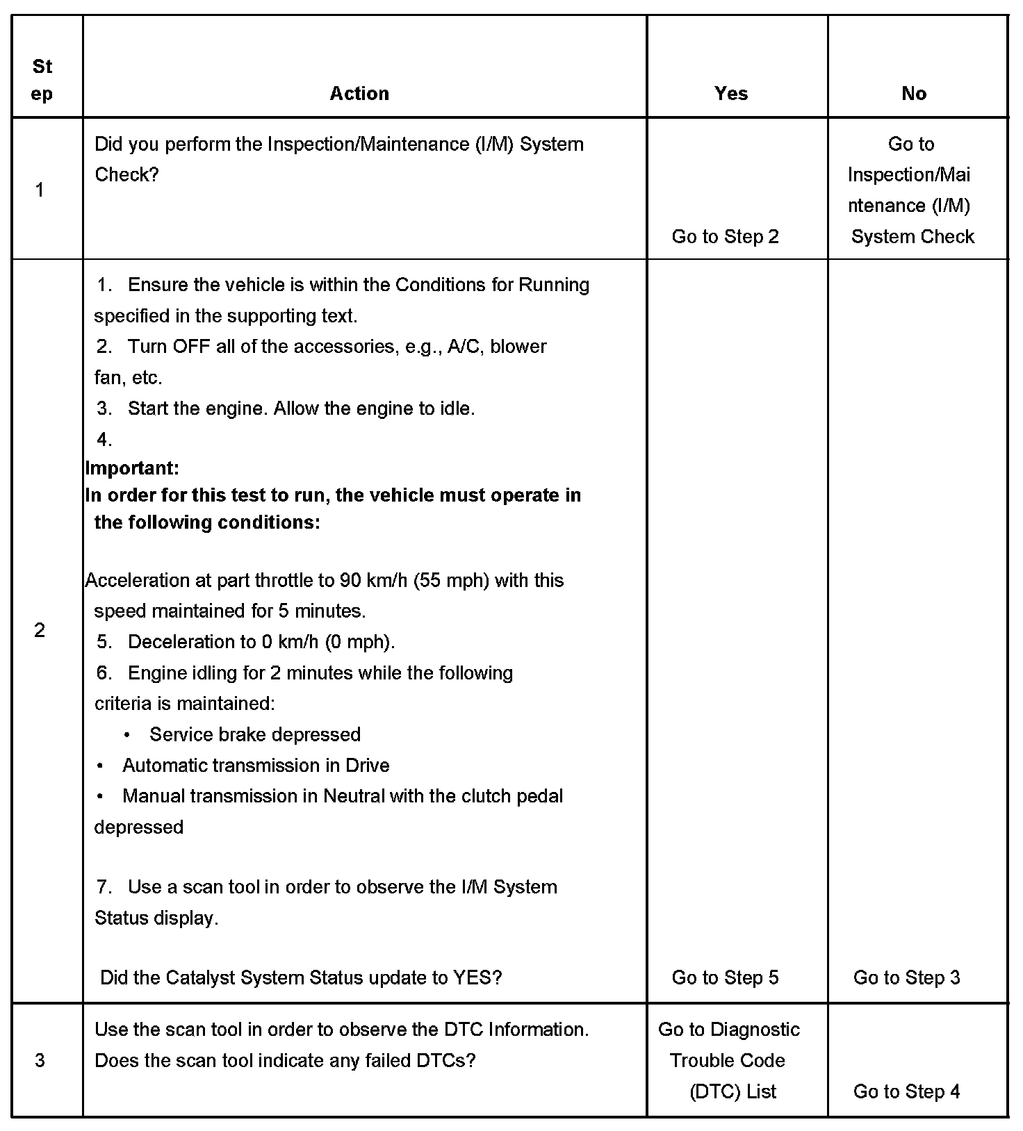 The purpose of this test is to satisfy the enable criteria necessary to execute I/M readiness diagnostics for the catalyst system. The test may be used to set the I/M System Status indicators to YES. Ensure the vehicle meets the requirements listed in Conditions for Running before performing this test. Failure to meet the necessary requirements may produce inaccurate test results.