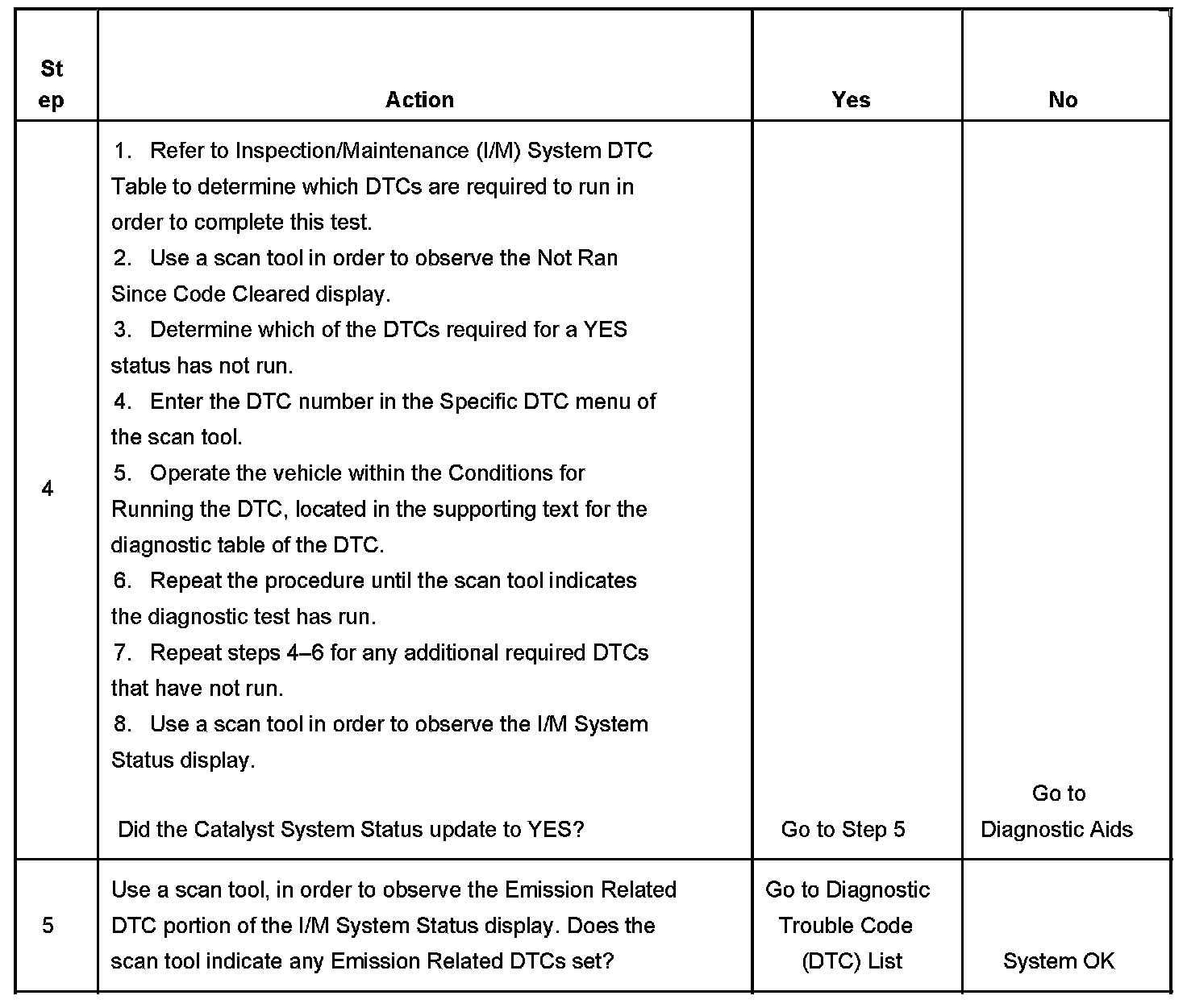 3. This step is to identify a first failure of a type B DTC. A DTC only appears on the I/M System Status display when the DTC becomes a MIL illuminating DTC. This occurs on the second failure of a type B DTC. A first failure of a type B DTC will not allow the I/M System Status to update to YES. Refer to Diagnostic Aids.