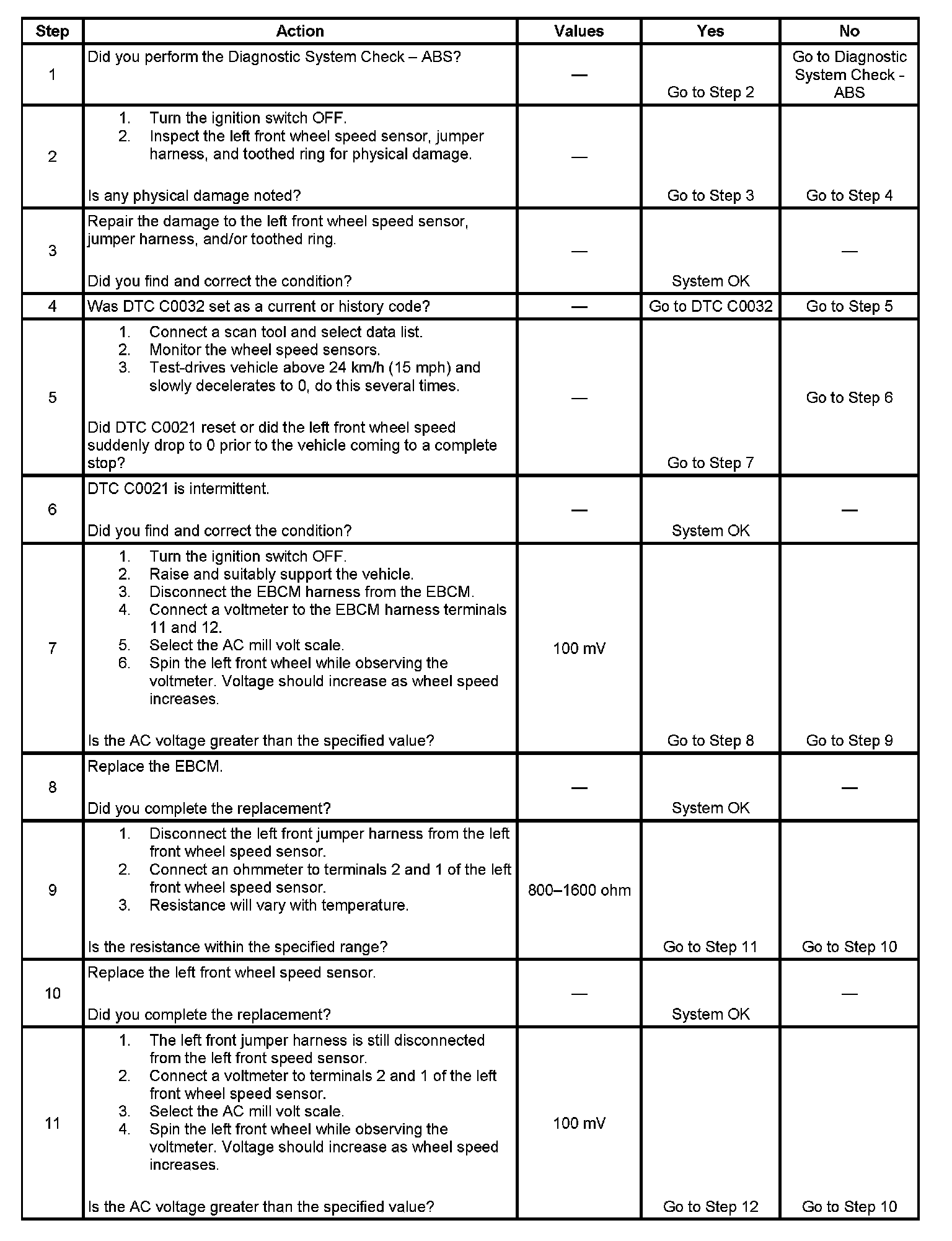 ^ If the conditions that set the DTC C0021 are no longer present, the DTC may be cleared by using the proper scan tool.