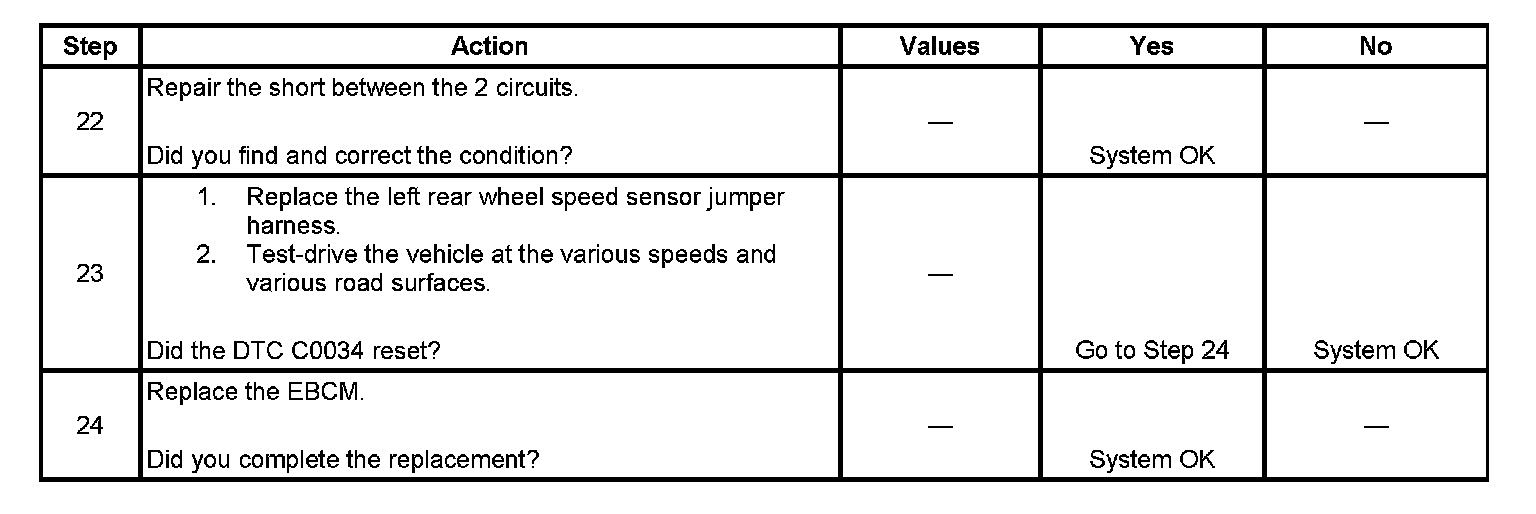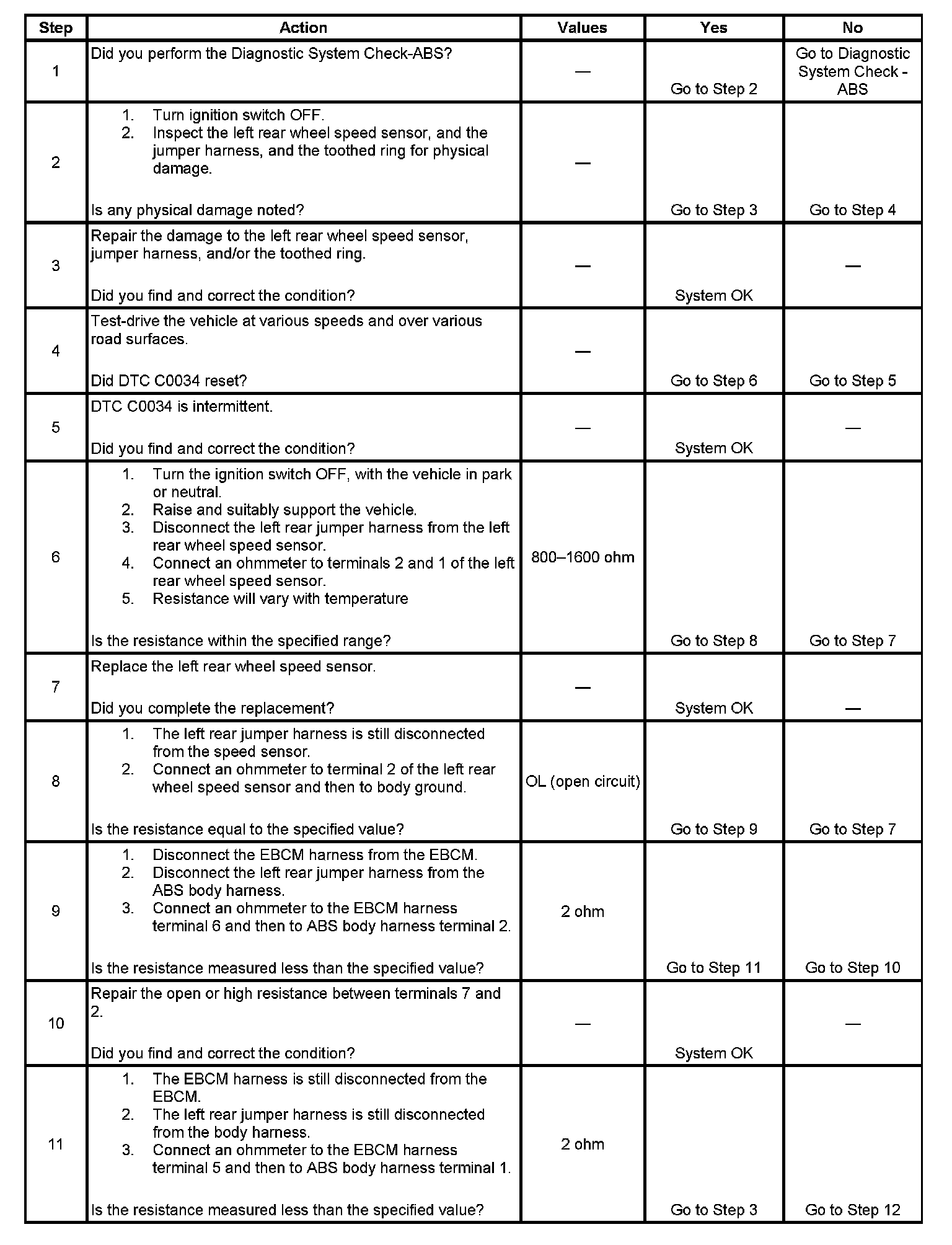DTC C0034 can be set anytime the key is ON and the EBCM has detected an open, short to ground, or a short to battery on the left rear wheel speed circuit.