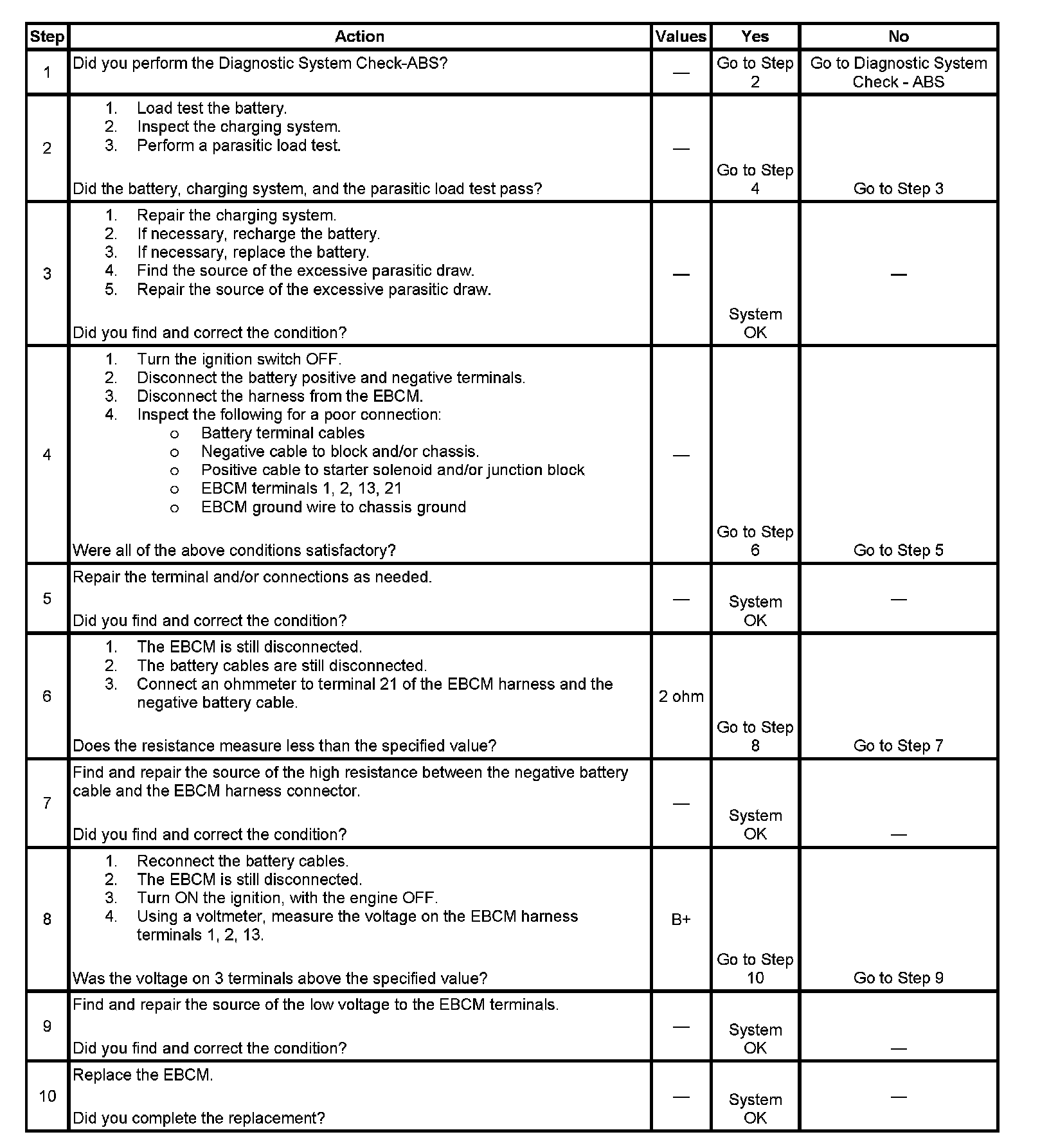 This circuit is used to monitor the voltage level available to the Electronic Brake Control Module (EBCM). If the voltage drops below a certain level, full performance of the system cannot be guaranteed. During ABS operation, there are several current requirements that will cause battery voltage to drop. Because of this, voltage is monitored prior to ABS operation to indicate a good charging system condition and also during ABS operation when voltage may drop significantly.