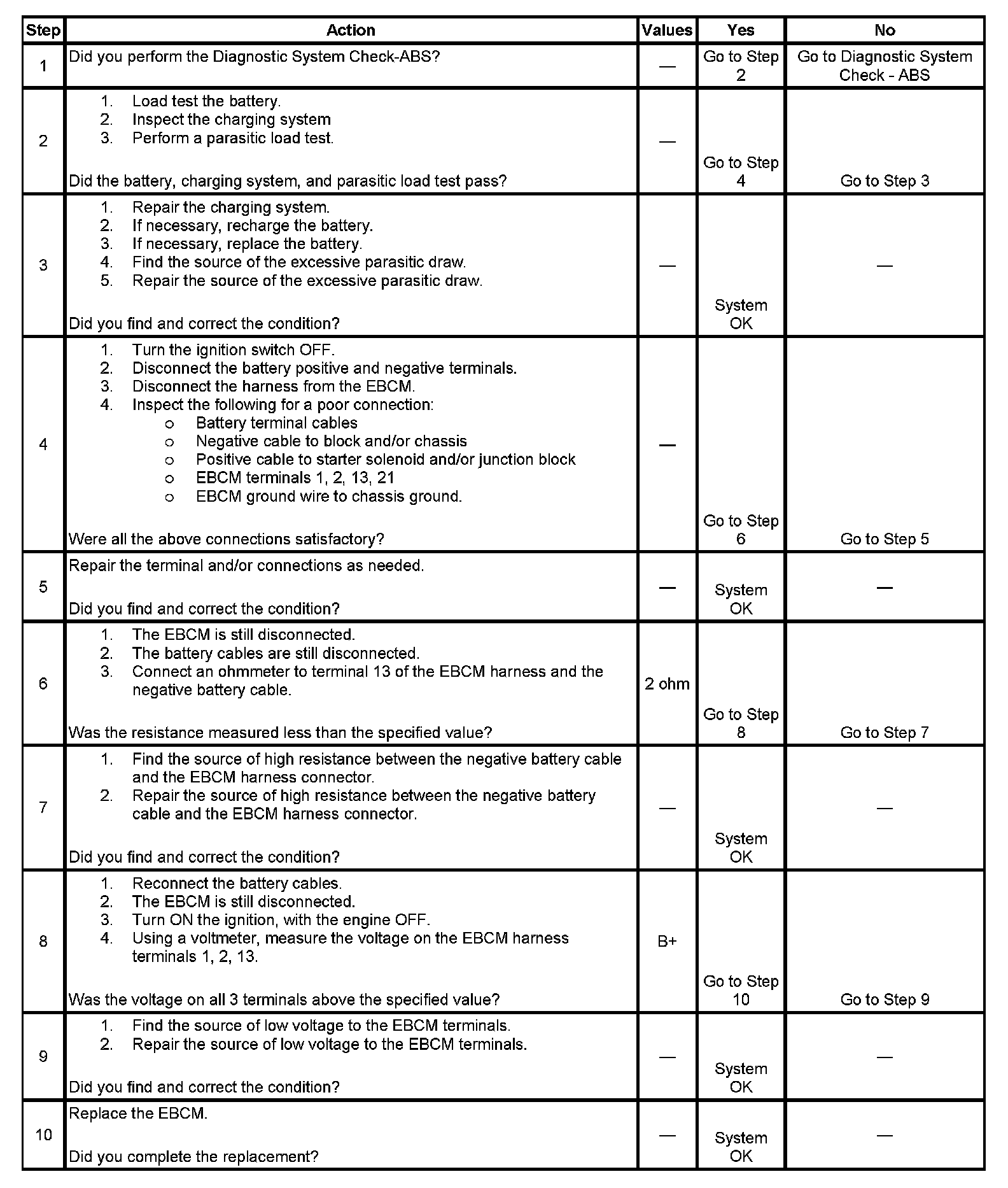 This DTC is used to detect a sudden loss of voltage or ground to the Electronic Brake Control Module (EBCM). Battery voltage is applied to terminals 1 and 2 Switched ignition voltage is applied to terminal 13.