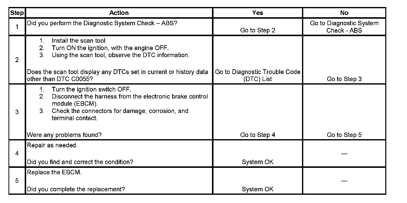 ^ If the conditions that set DTC C0055 are no longer present, the DTC may be cleared by using the proper scan tool.