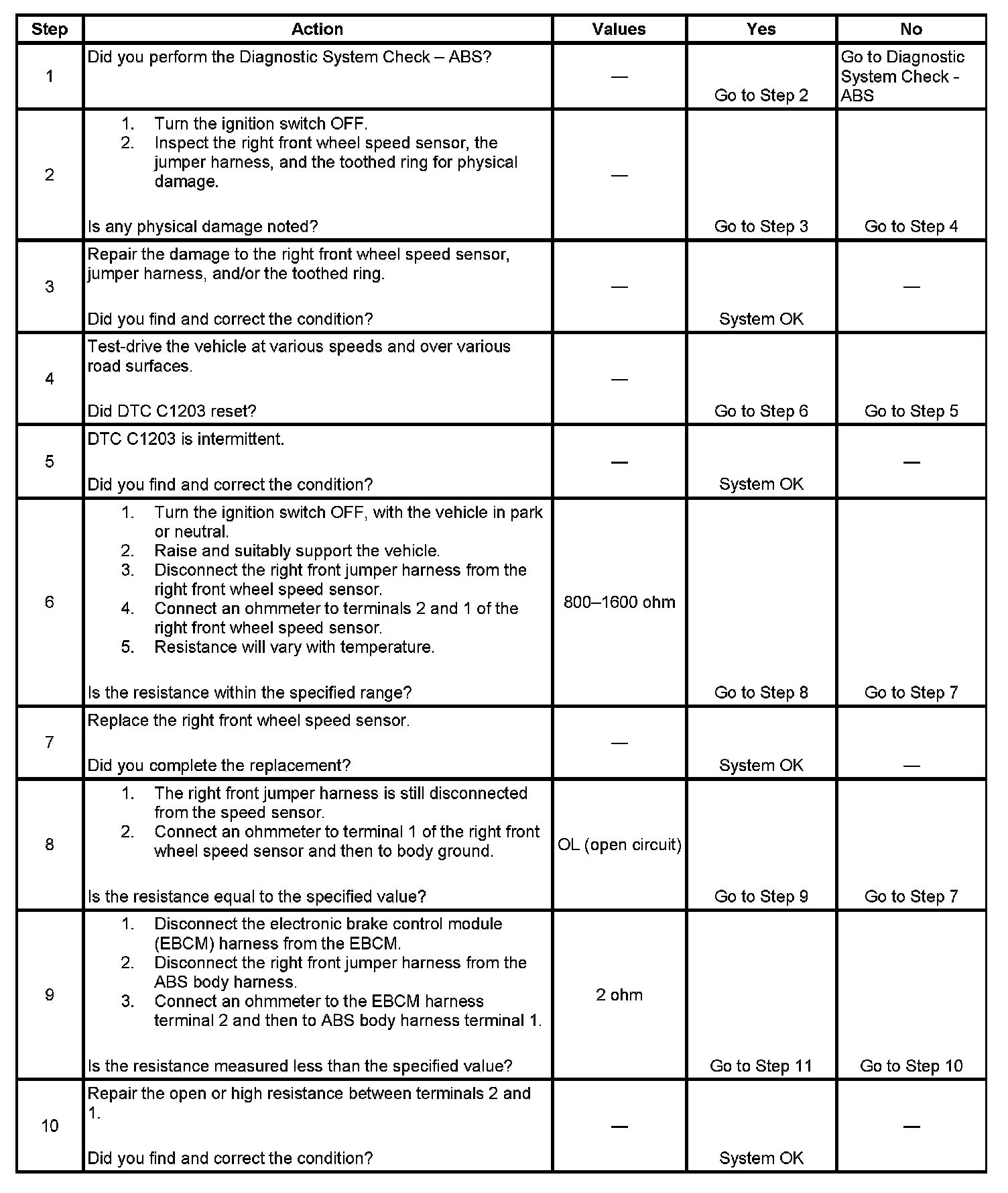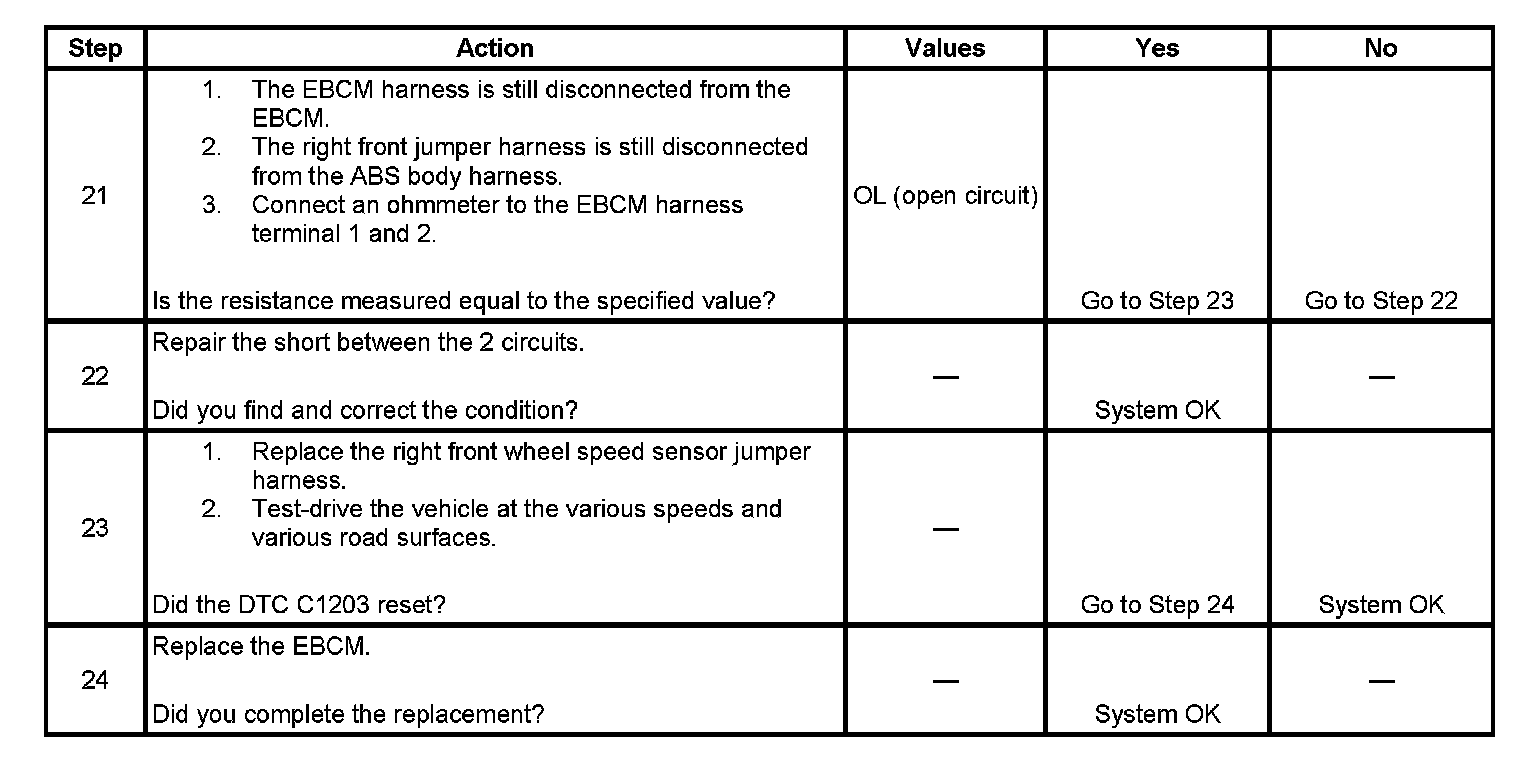 DTC C1203 can be set anytime the key is ON and the EBCM has detected an open, short to ground, or a short to battery on the right front wheel speed circuit.